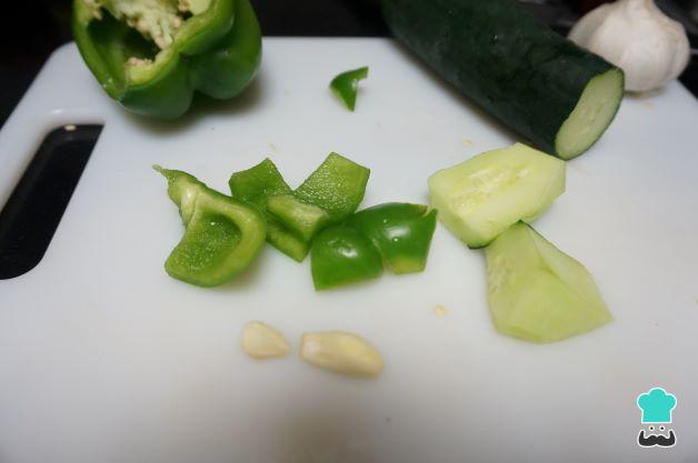 Lava el pimiento verde y el pepino, pélalos y cortalos. También pela el diente de ajo.