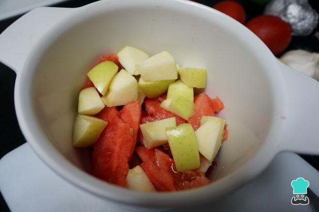 Truco: la cantidad de manzanas puede variar según te guste el sabor. La mejor manera de saberlo es cuando esté listo el gazpacho, probarlo y proporcionar el sabor que te guste, puedes añadir más manzanas o más sandía.