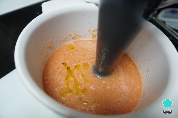 Empieza a batir y triturar los ingredientes del gazpacho de sandía y manzana, ve añadiendo aceite de oliva y triturando hasta que quede una crema homogénea.
