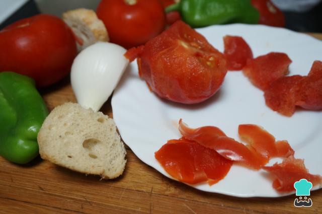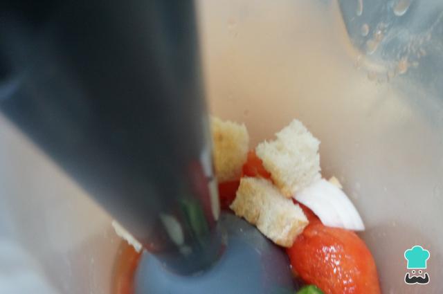 Añade un poco de agua agua fría hasta dejarlo con la consistencia que te guste, tritura muy bien. Si observas que queda muy claro, puedes añadir más pan o verduras, aunque estas tienen bastante agua.