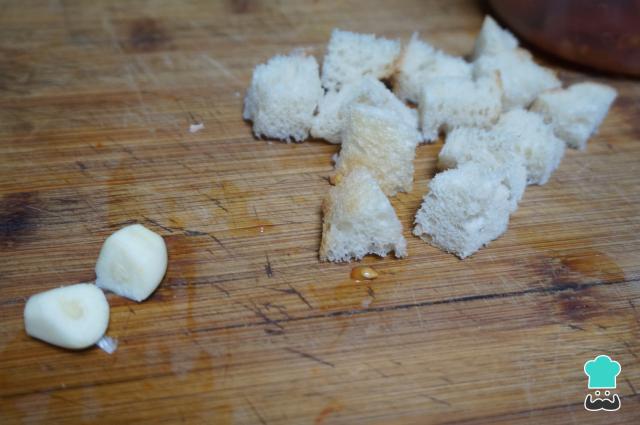 Corta el pan, es mejor si es de un día o dos, retira la corteza y deja la miga. A continuación, trocea y añade a la batidora, se puede poner el pan en remojo primero si está muy duro, pero como lo triturarás no hace falta.