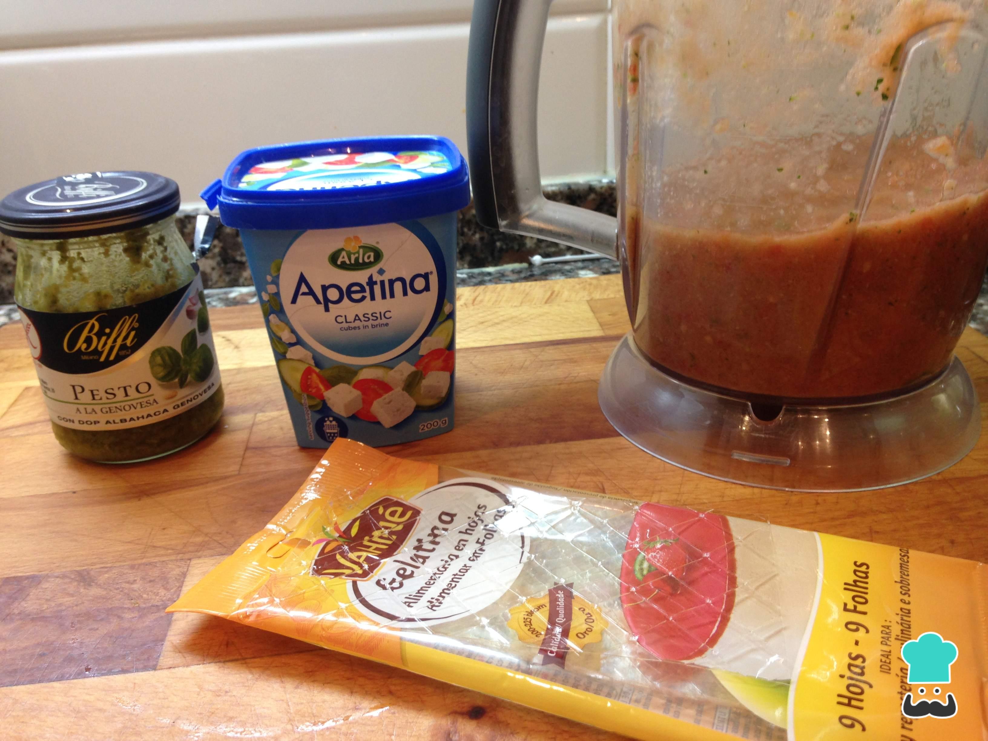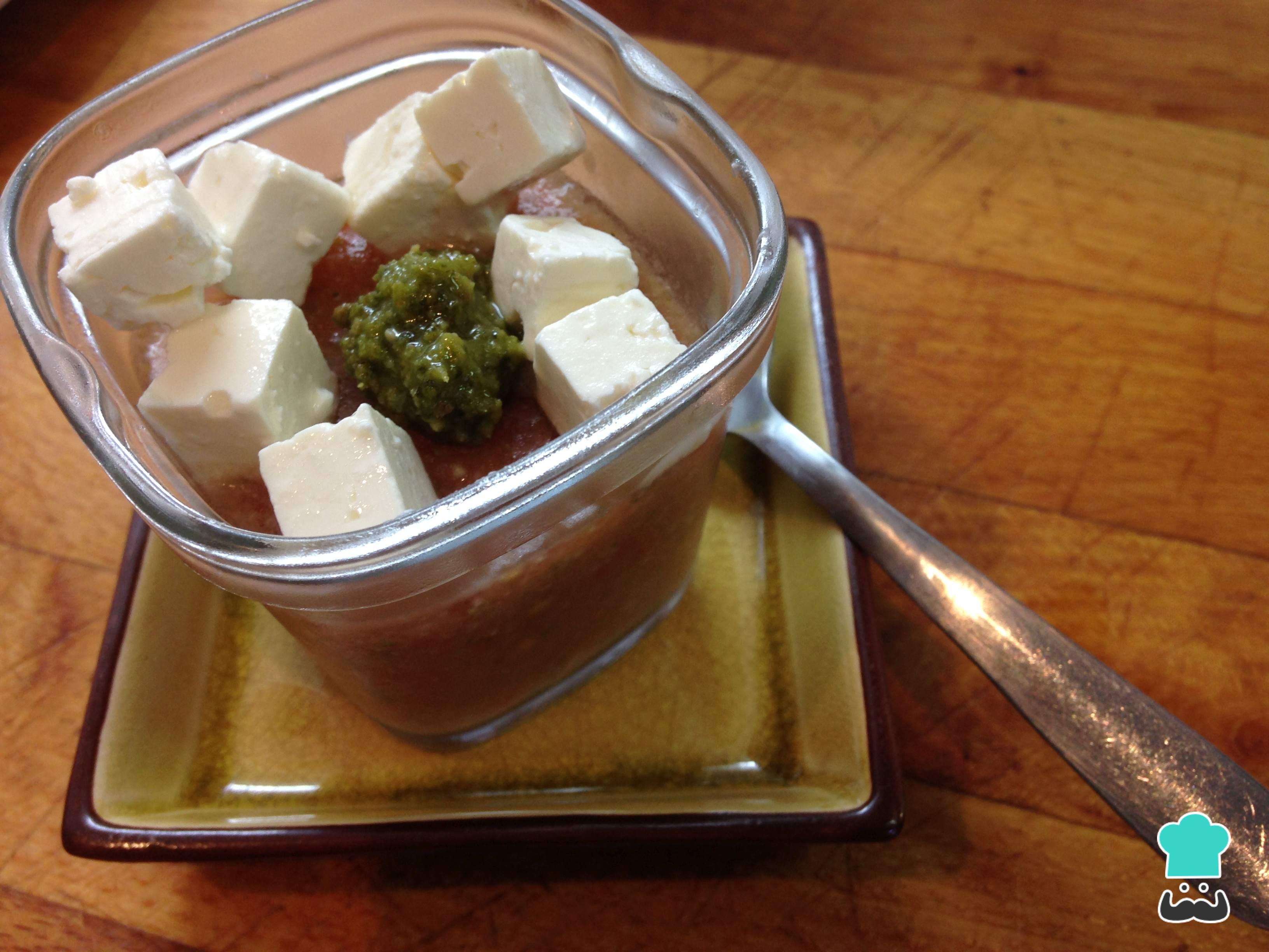 Cuando tengamos ya la gelatina de gazpacho, añadimos una cucharadita de pesto en el centro de cada vasito y unos daditos de queso feta alrededor, aunque puedes optar por otros ingredientes de acompañamiento, como aceitunas negras. ¡Buen provecho!