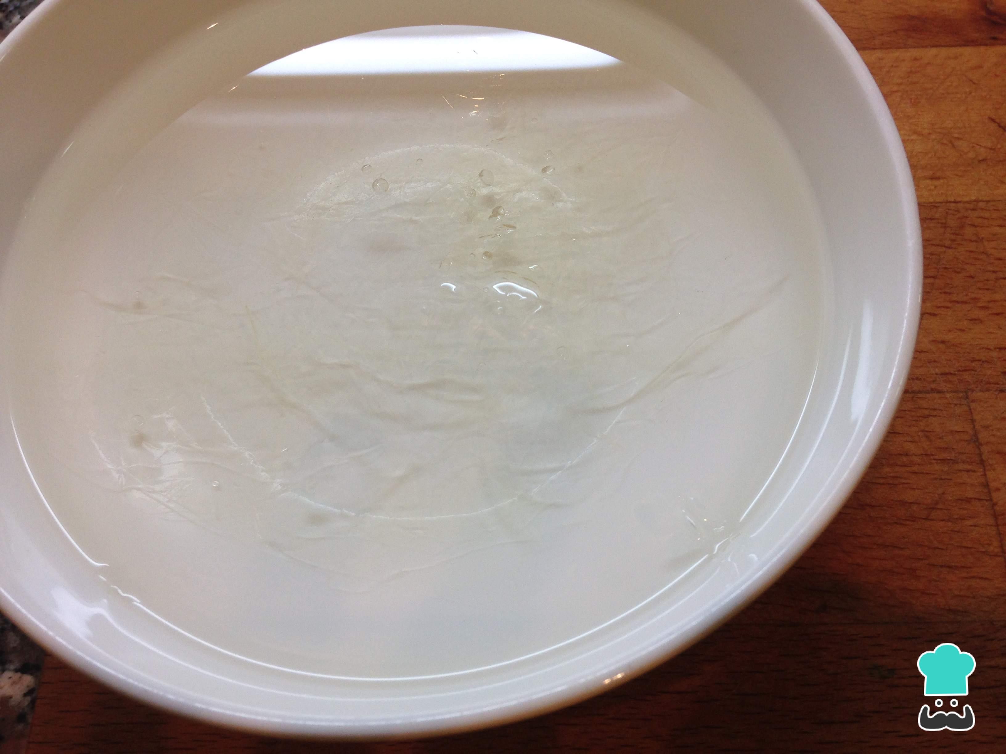 Hidratamos las hojas de gelatina (una hoja por cada 100 mililitros de gazpacho) siguiendo las indicaciones de la marca, cinco minutos en agua fría, y luego las mezclamos con agua caliente para derretirlas.