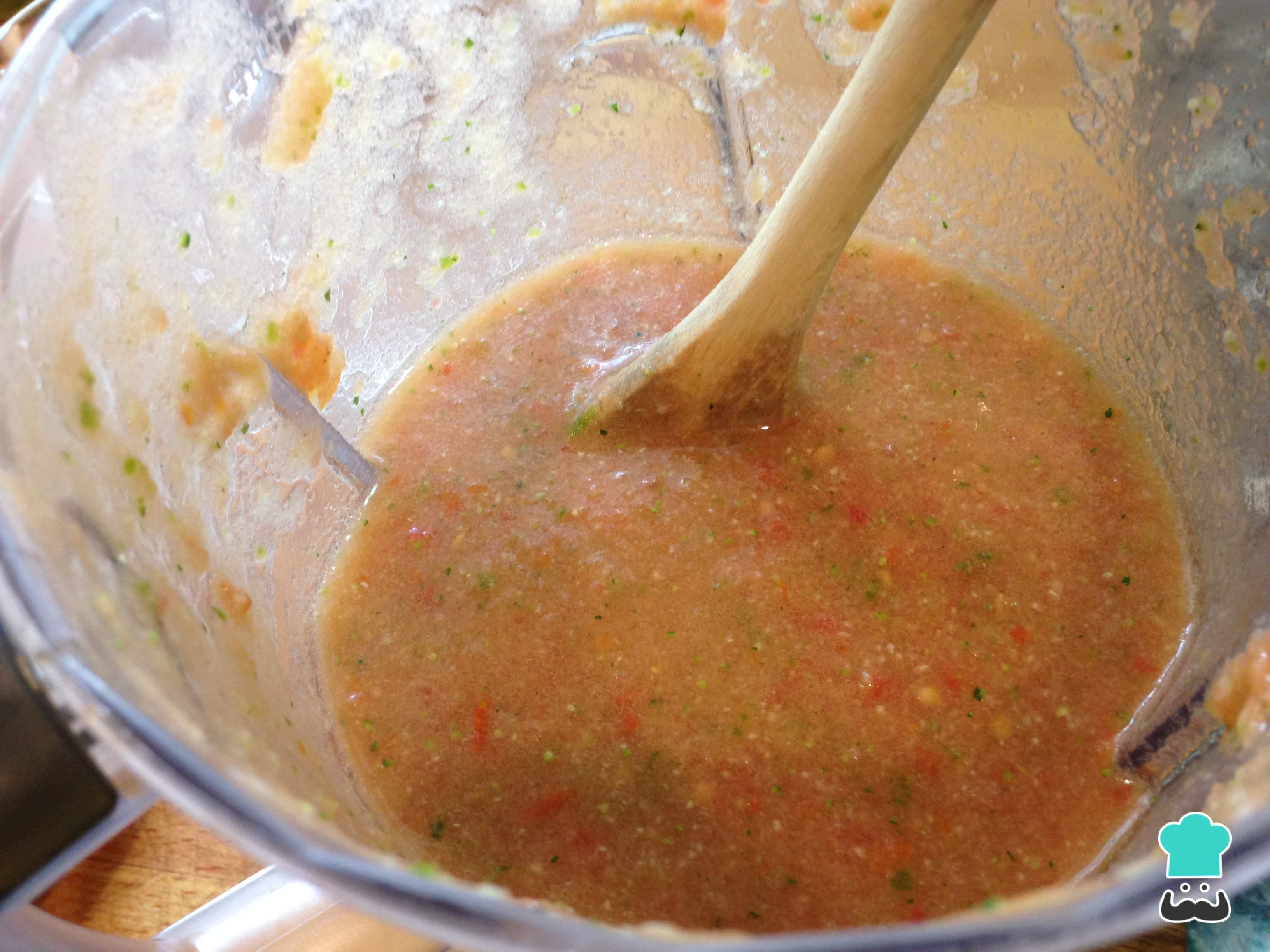 Vertemos la gelatina derretida sobre el gazpacho y removemos bien.