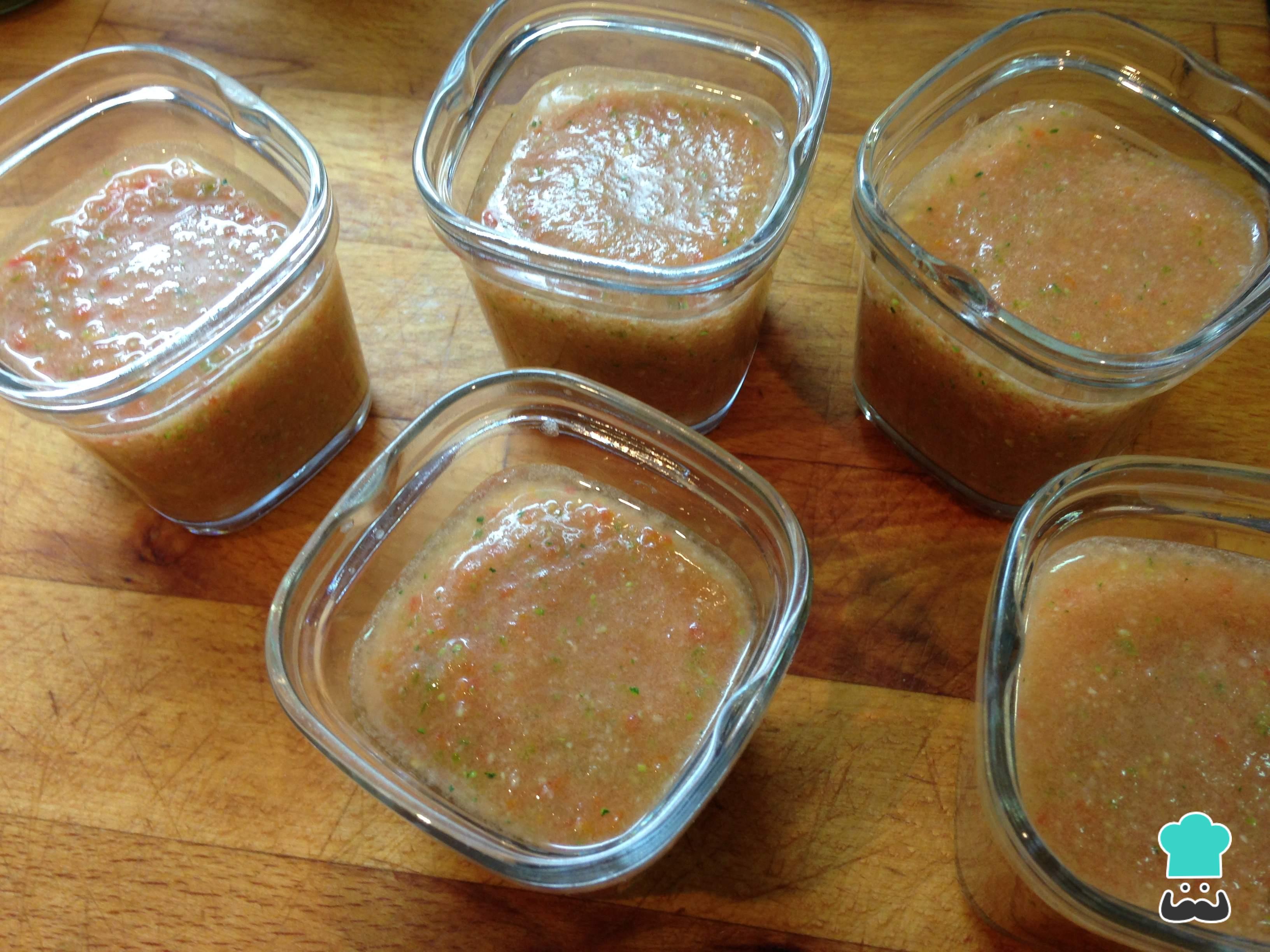 Repartimos ahora el gazpacho en vasitos individuales y los introducimos en la nevera, preferentemente durante toda la noche para que el gazpacho se solidifique.