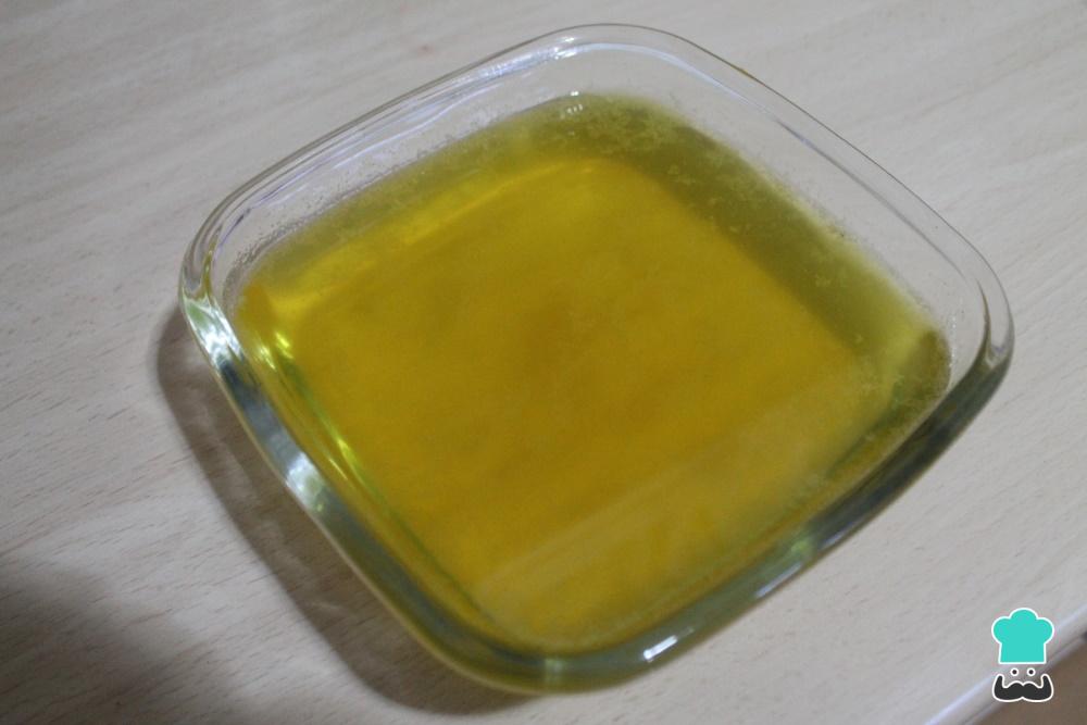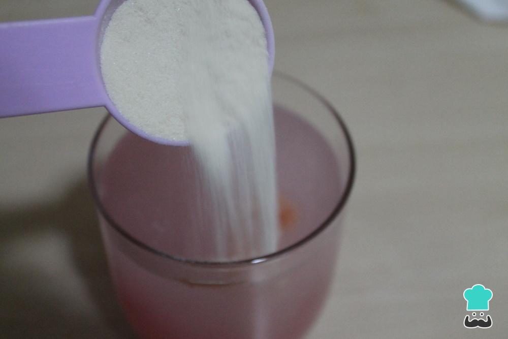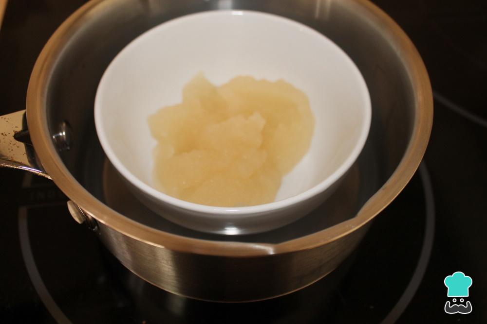 Disuelve las cuatro cucharadas de gelatina en polvo neutra en 100 gr de agua. Te quedará una mezcla espesa. Pon la mezcla en un bol al baño maría y calienta en el fuego hasta que se vuelva líquida.