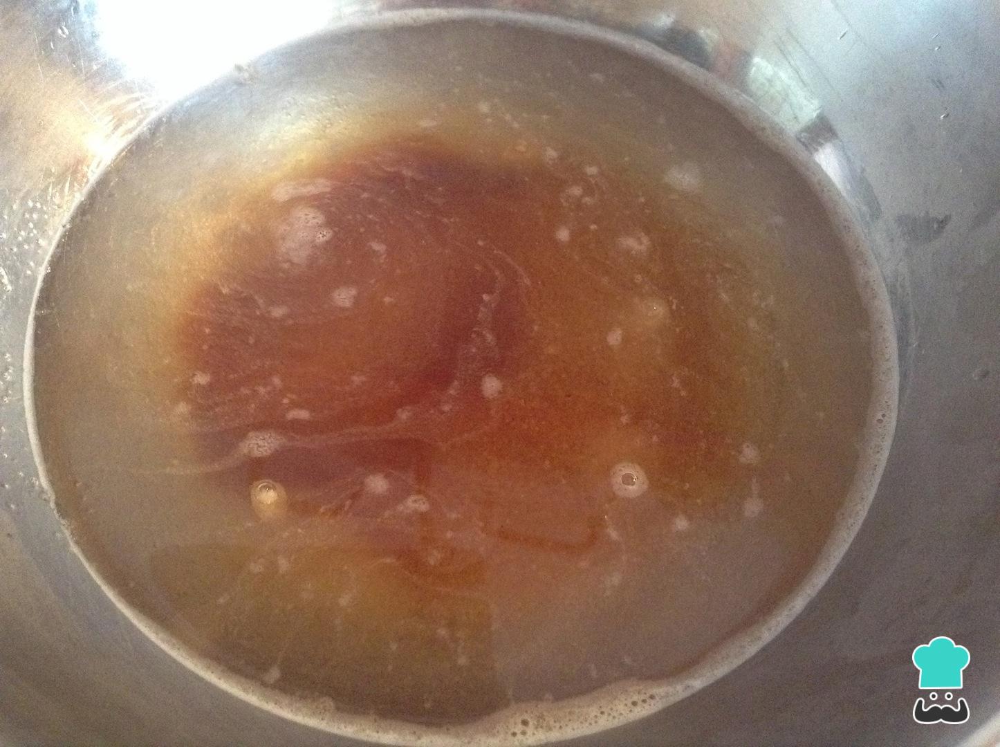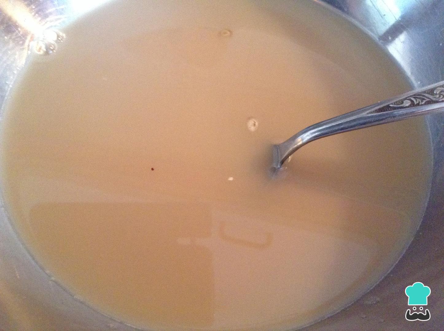 Cuando la mezcla de gelatina, agua y azúcar esté fría, añade la leche y la esencia de vainilla.