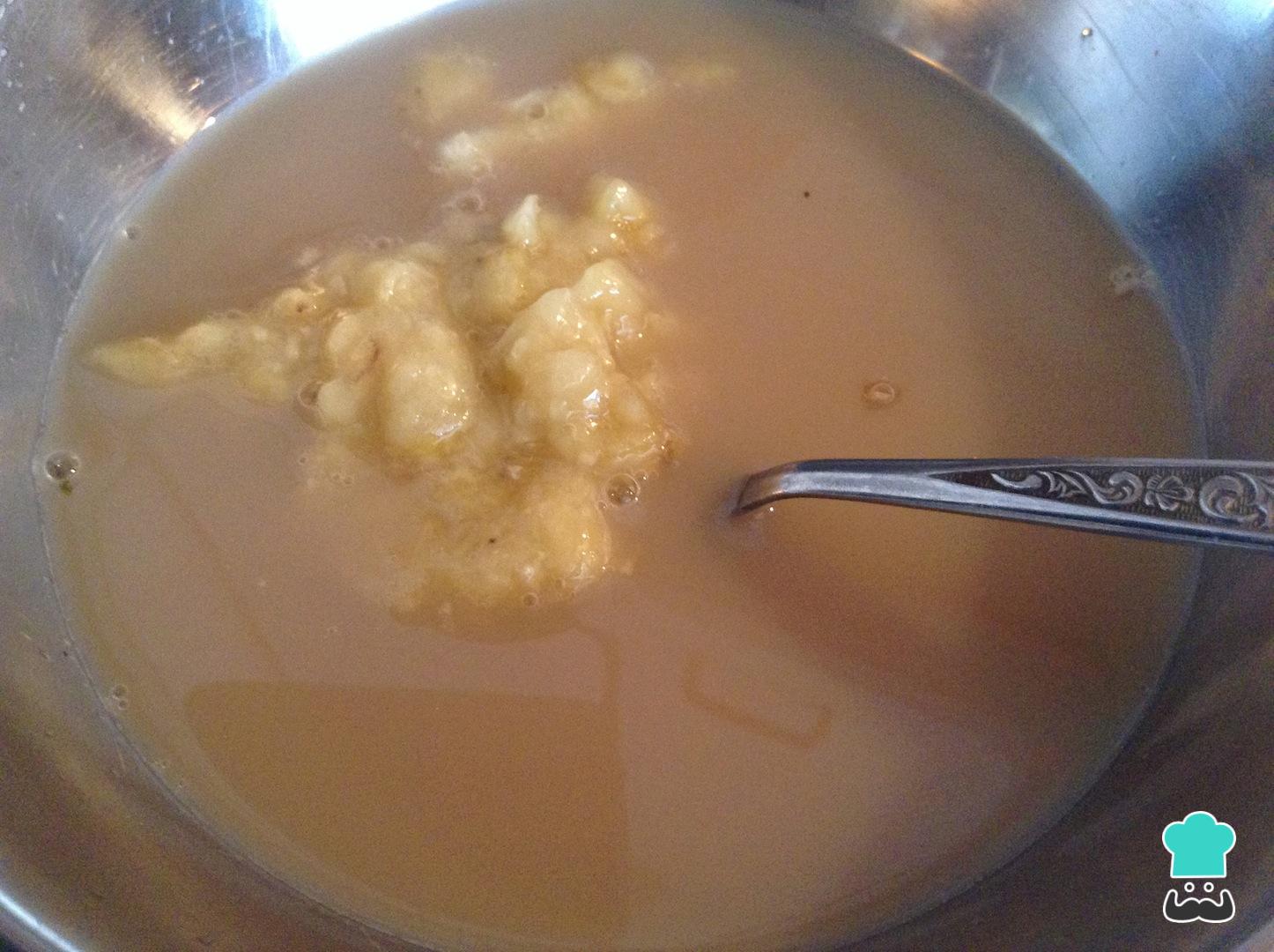 Incorpora también el puré de plátano y mezcla hasta integrar. Mi recomendación es la siguiente: utiliza la licuadora para obtener una mezcla más fina.