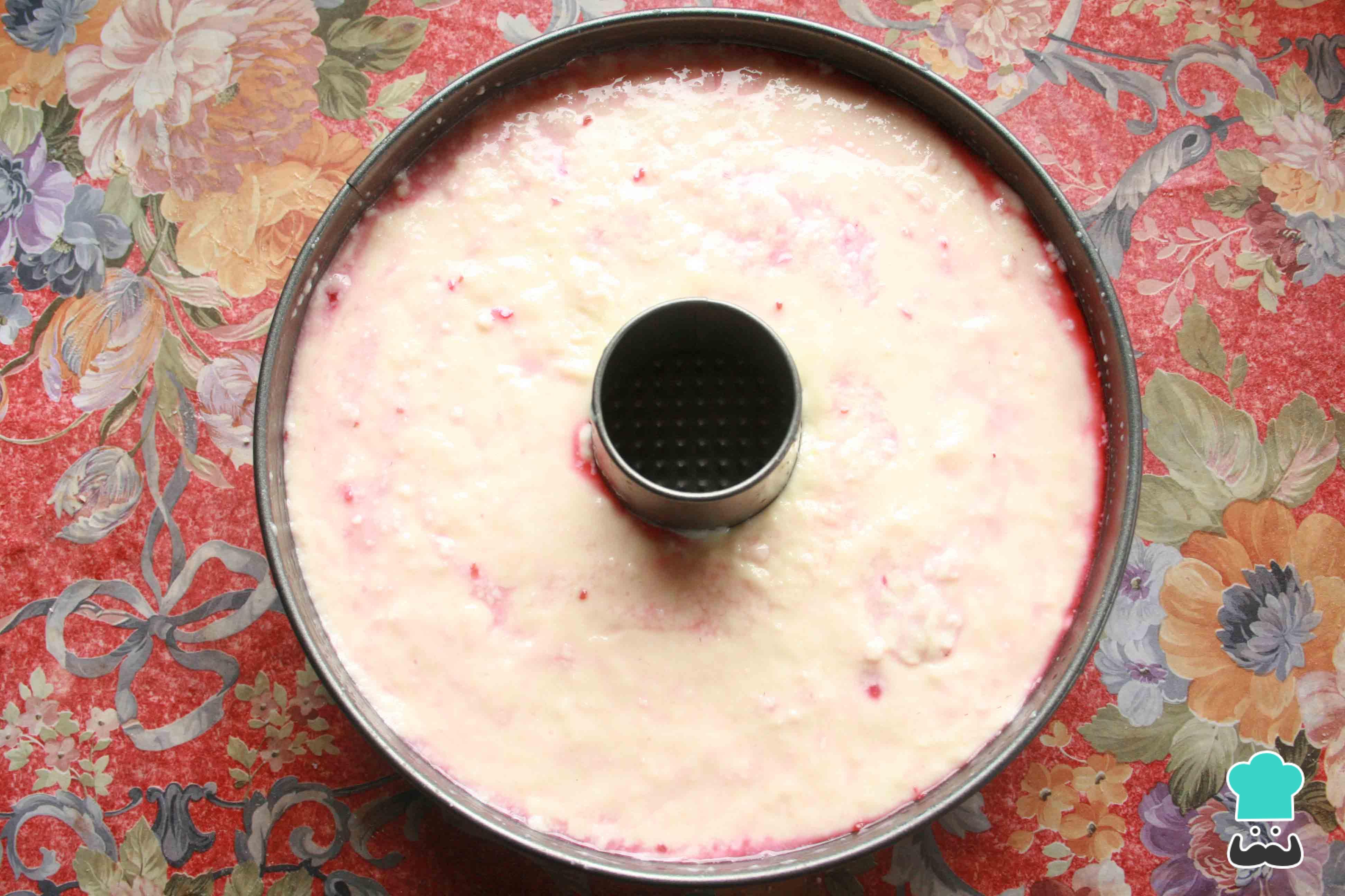 Agrega las dos tazas de frutas y remueve. Previamente escurre las frutas antes de integrarlas a la mezcla. El cóctel frutal puede ser de frutas tropicales o frutas del bosque, según tu preferencia.