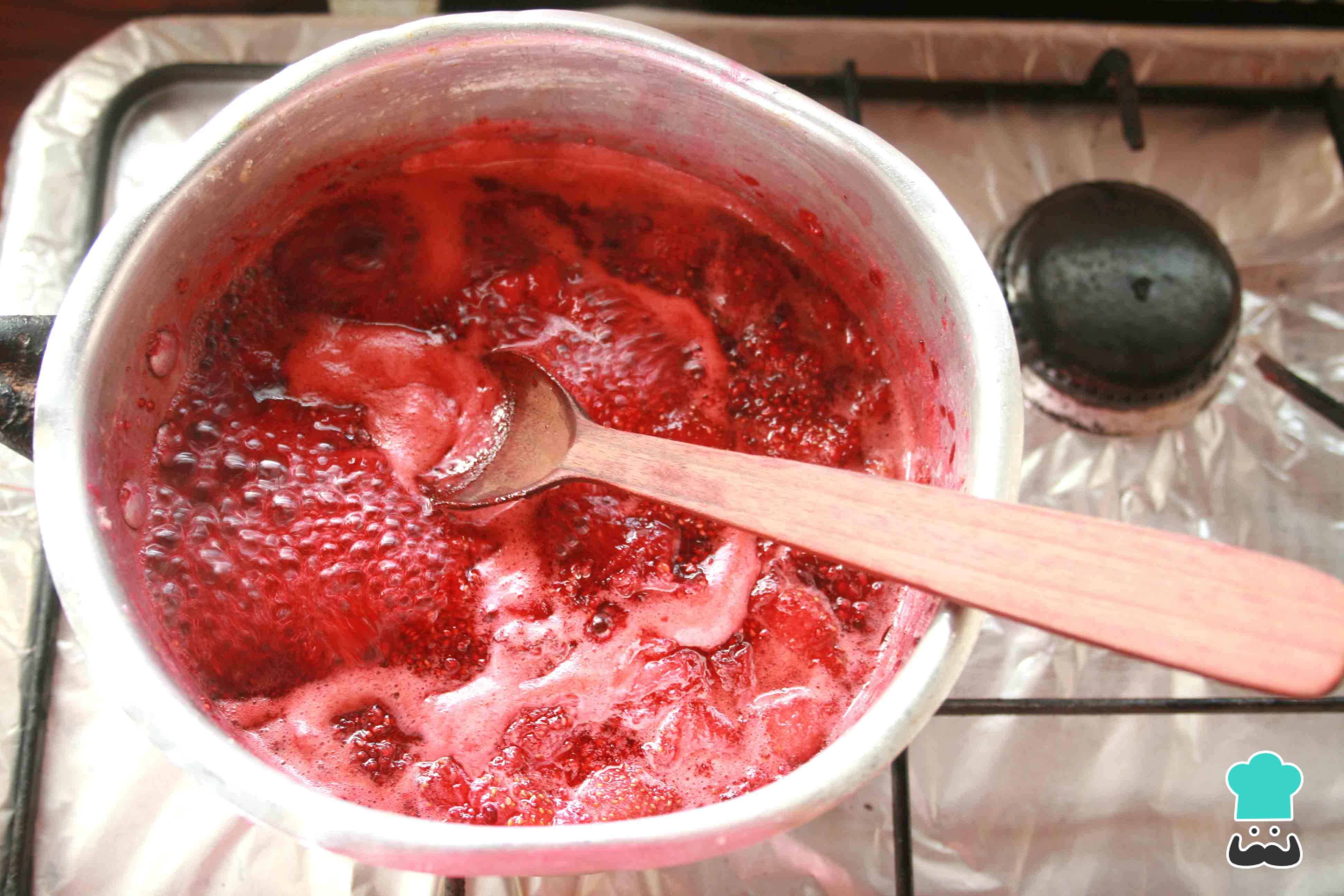 Prepara la salsa de frutos del bosque. Coloca un cazo con el azúcar y el jugo de naranja, caliéntalo fuego medio-alto y espera hasta que hierva. Mueve frecuentemente y cuando alcance su punto de ebullición, hierve por 5 minutos más y remueve de vez en vez. Después, agrega las 4 tazas de frutos del bosque y calienta hasta que hiervan. Espera de 5 a 8 minutos o hasta que revienten los frutos y espese un poco la mezcla. Remueve constantemente. Una vez lista la salsa, deja refrescar a temperatura ambiente, cuela, cubre y reserva en el refrigerador durante 3 horas.