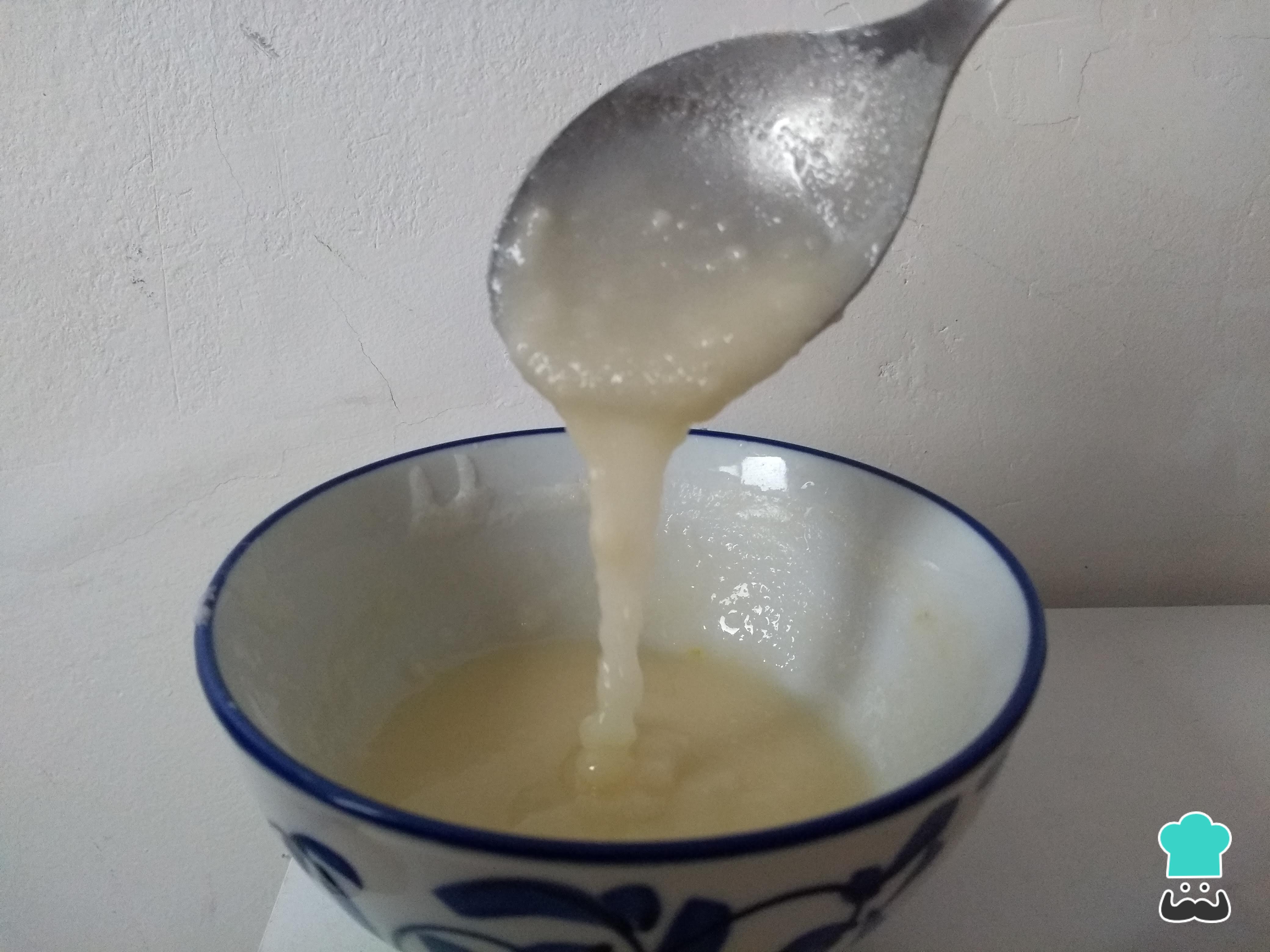 En la siguiente fotografía puedes ver una consistencia ideal para cubrir los budines, donde al girar la cuchara se crea un hilo bastante grueso. Si tu glasé queda muy líquido, el hilo será más fino y quedará demasiado transparente, no se notará sobre el budín. Por eso es importante que incorpores glaseado de naranja para bizcocho poco a poco.
