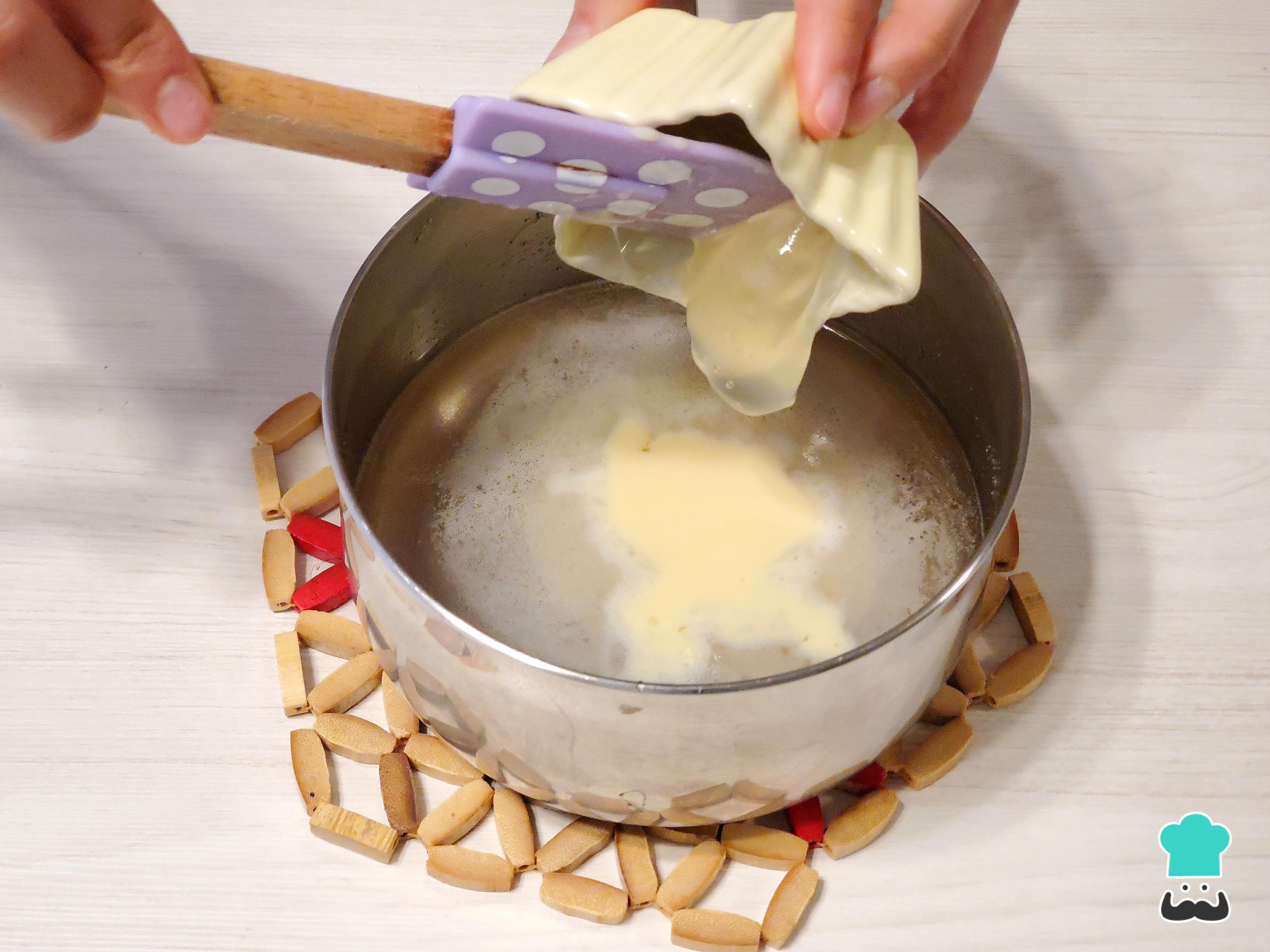 Tan pronto como hierva, retira del fuego y agrega el brillo neutro o abrillantador y la leche condensada.
