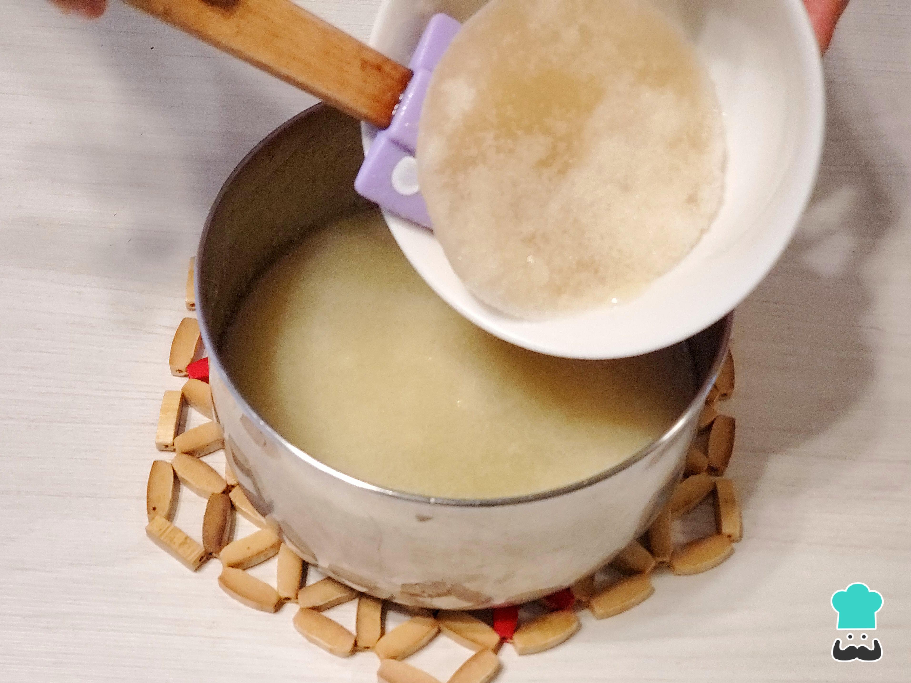 Cumplido el minuto, retira inmediatamente del fuego e incorpora la gelatina previamente hidratada. Remueve hasta que se derrita.