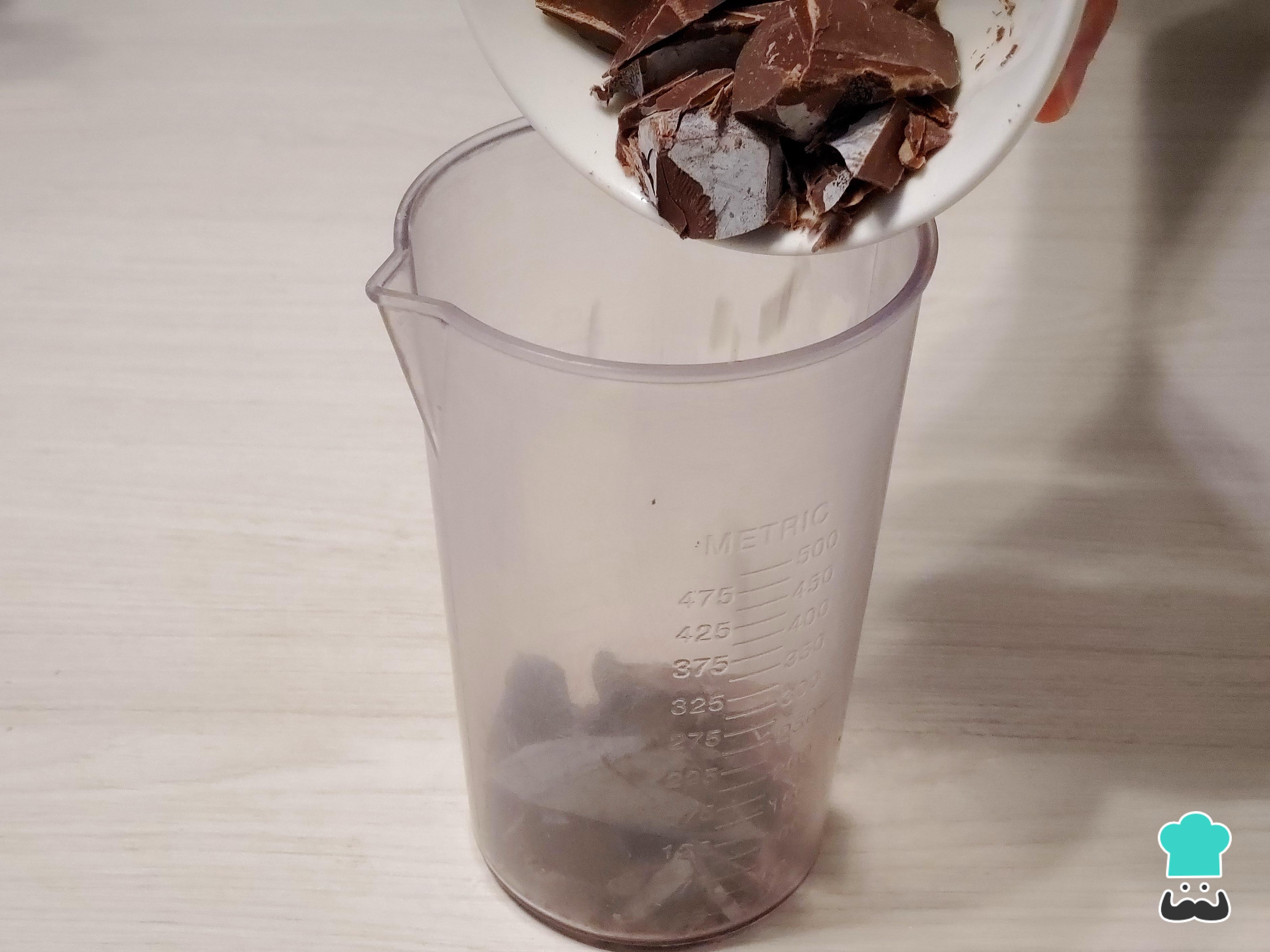 Aparte, coloca rápidamente el chocolate previamente troceado en el vaso del mixer (minipimer) o procesador de mano, es importante que este vaso sea alto y estrecho para evitar introducir burbujas al glaseado.