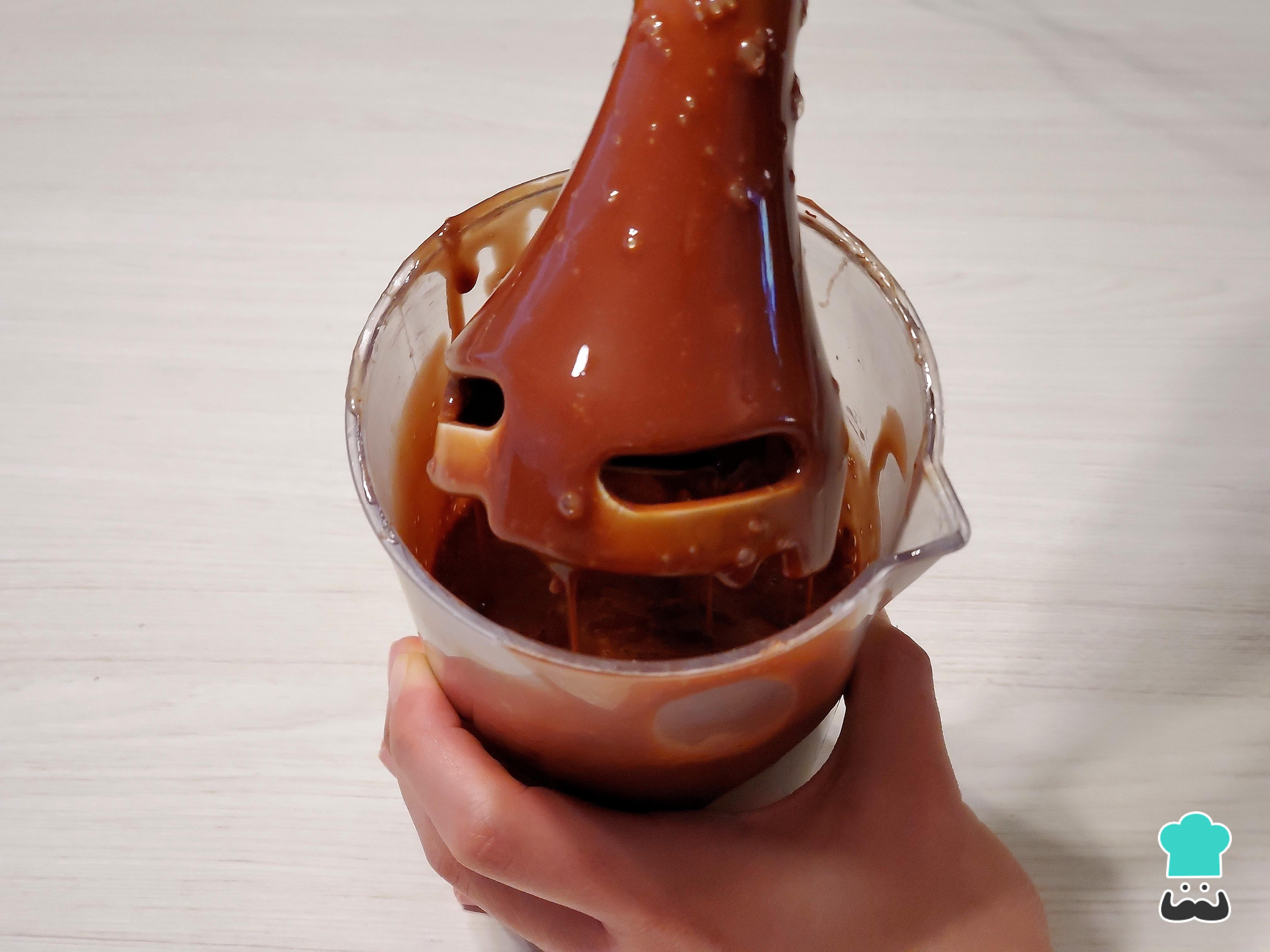 A continuación, vuelca sobre el chocolate bitter o blanco. Dejar reposar un par de minutos para que el chocolate tome temperatura y emulsiona con el mixer o procesador de mano hasta obtener una mezcla homogénea.