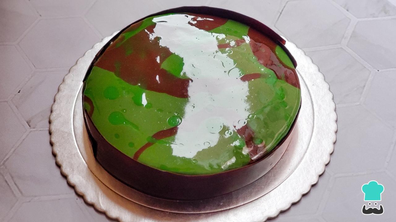 - Calienta ambos glaseados a los 35 °C y viértelos sobre la torta congelada rápidamente.