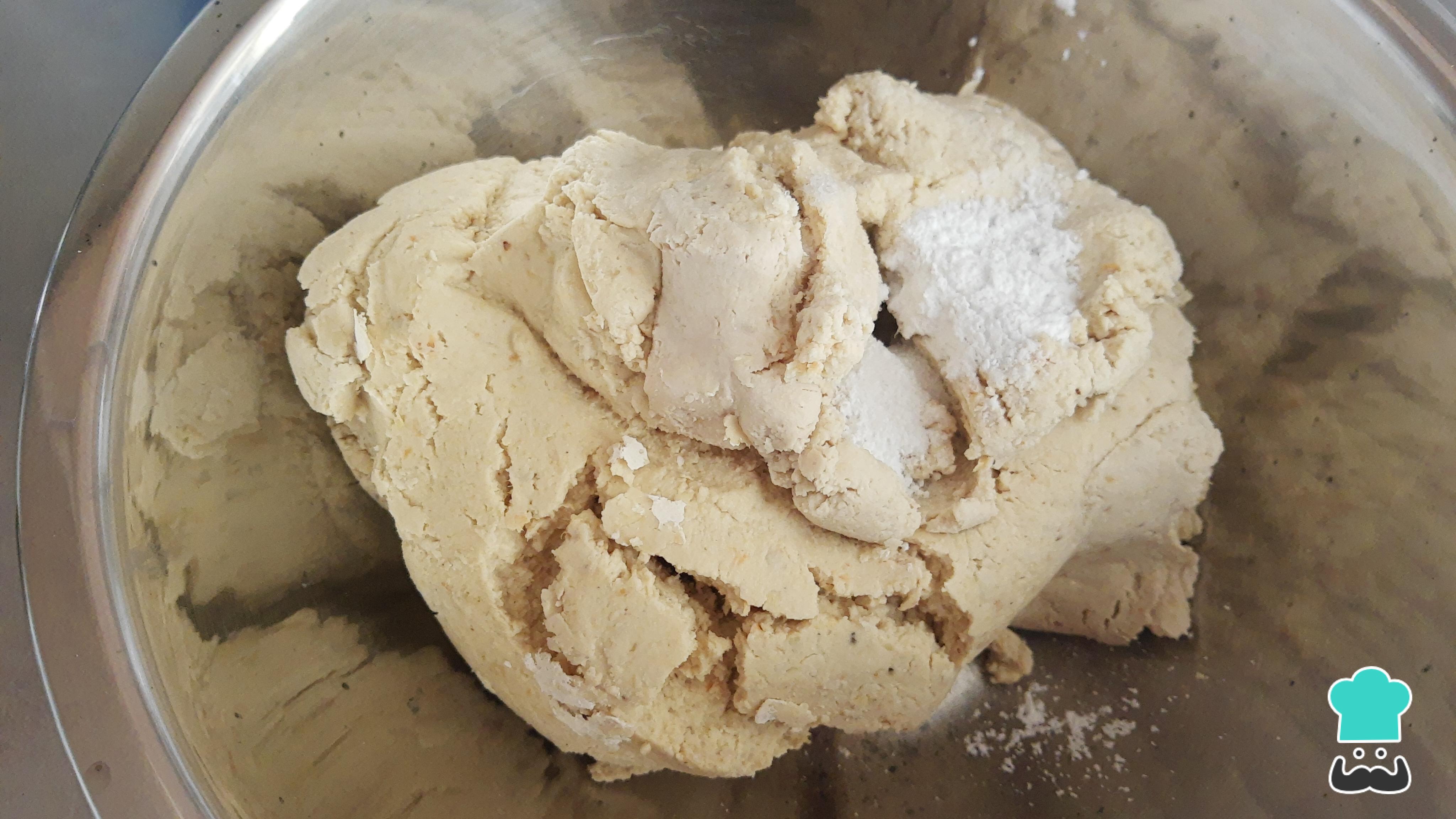 Para hacer esta receta de gorditas de frijol con queso, primero prepara la masa. Para ello, coloca en un recipiente la masa, la pizca de sal y una cucharadita de polvo para hornear. Señalamos que puedes conseguir la masa en tortillerías o bien puedes hacerla tu mismo con harina de maíz nixtamalizado de acuerdo con las indicaciones del empaque. Y, si consigues la masa ya lista, probablemente la encuentres un poco dura, si es así añade caldo de pollo hasta que esté más suave. Ten en cuenta que no debe quedar aguada. Cuando esté lista e integrada con los demás ingredientes tapa y deja reposar por 20 minutos.