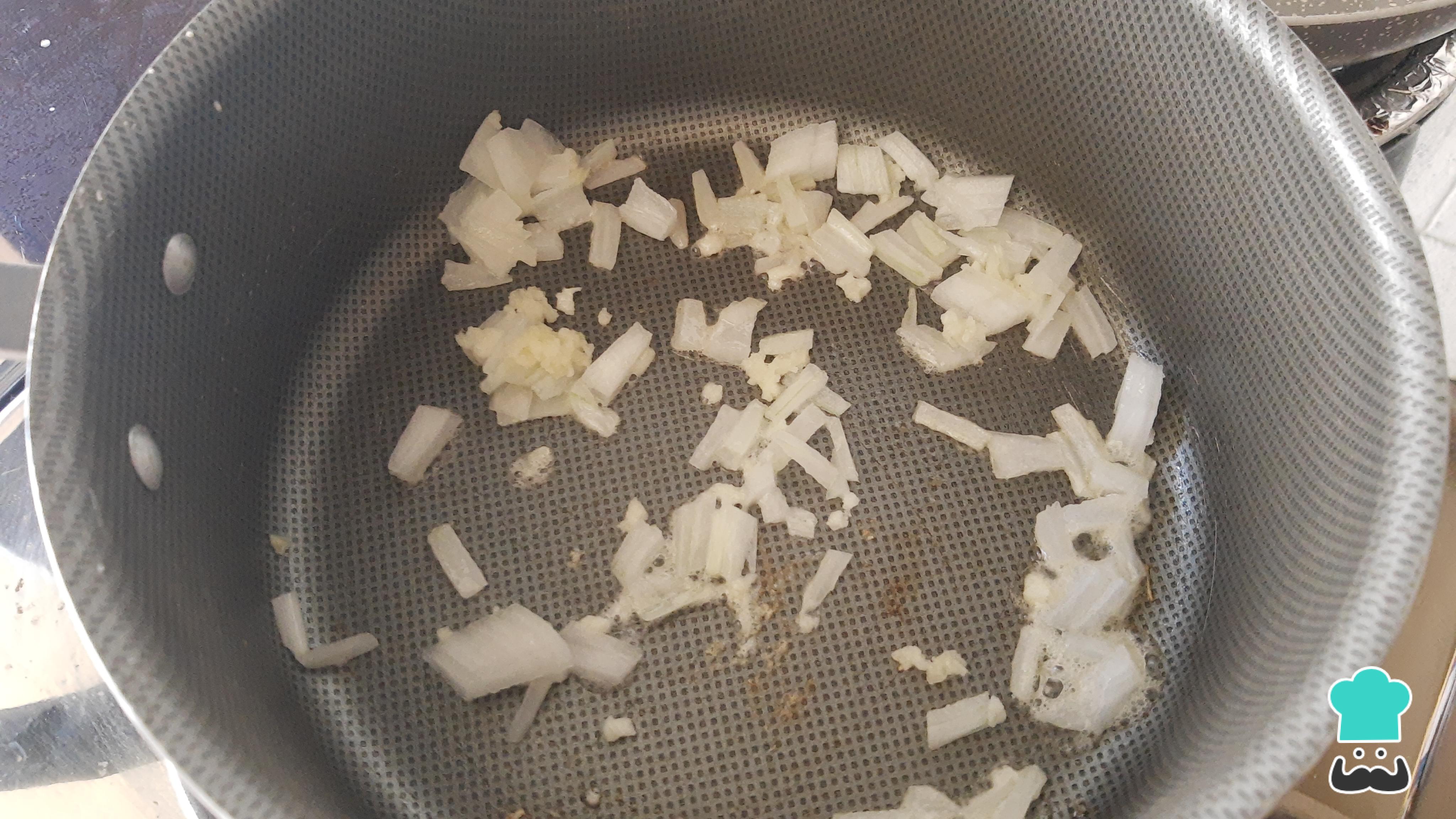 Mientras reposa la masa, en una olla con un poco de aceite caliente, sofríe la cebolla y el ajo picado hasta que ambos se doren ligeramente.
