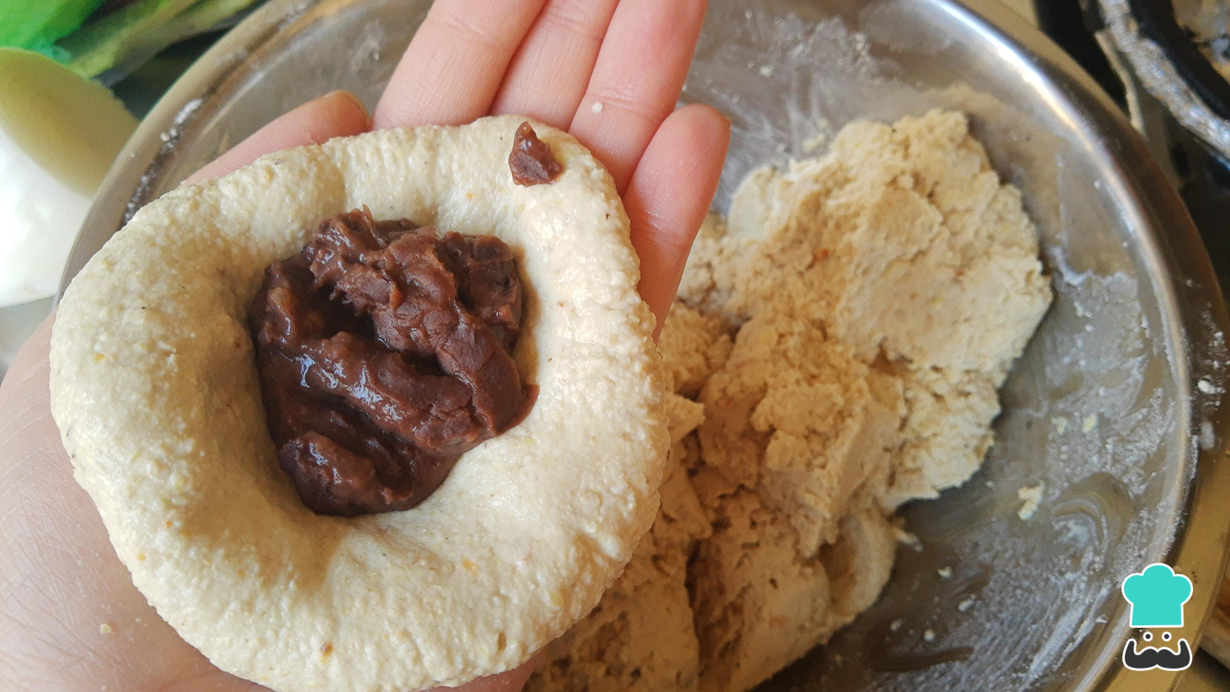 Toma una porción de la masa, boléala y empieza a formar una especie de cuenco. Luego, rellena con los frijoles y cierra para después presionar para formar el disco. Repite el proceso hasta terminar con tu masa.