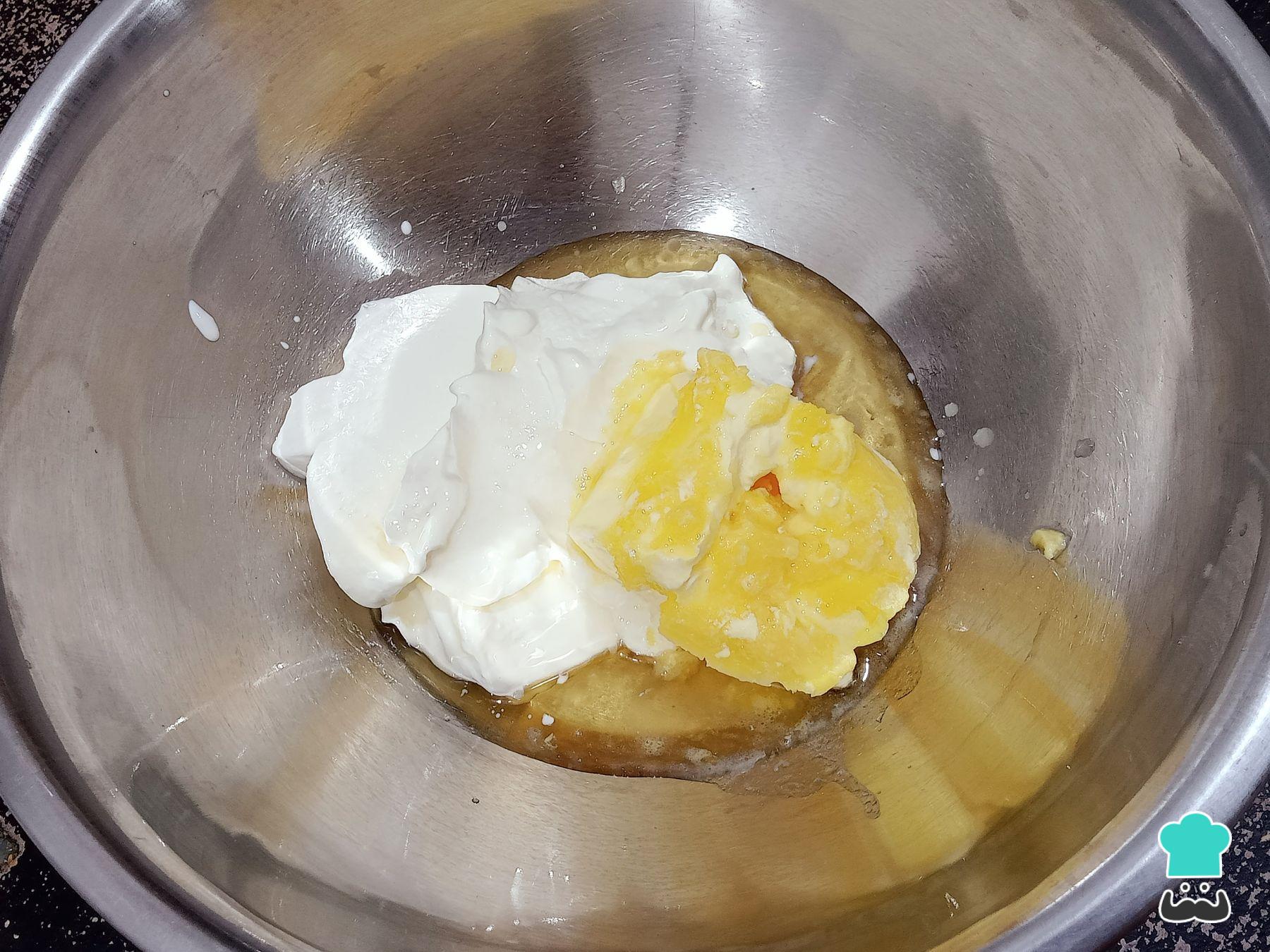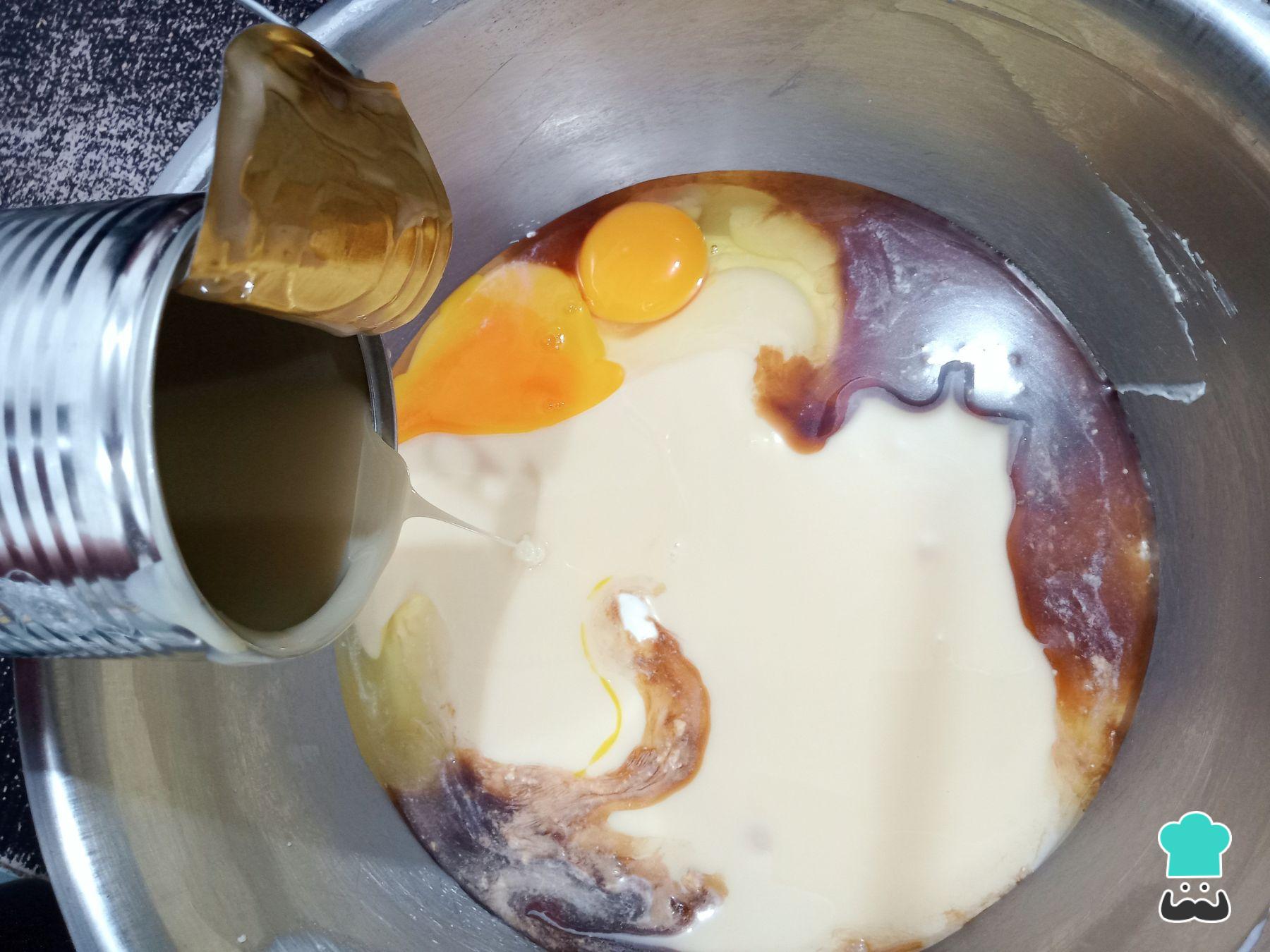 Añade la leche condensada, los huevos 1 a 1 y la vainilla. Mezcla todo muy bien.