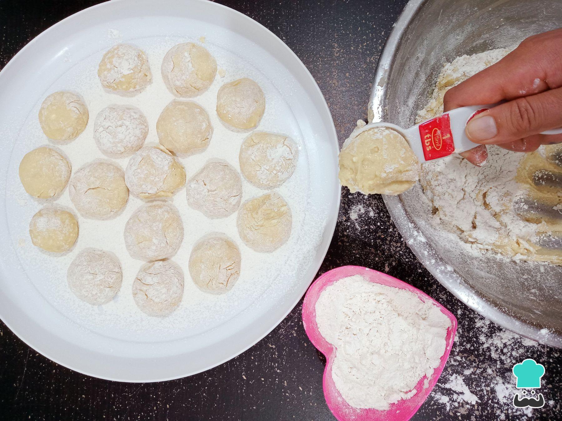 Transcurrido el tiempo de reposo, cubre una charola con harina y con ayuda de una cuchara también enharinada, forma bolitas con la masa, todas del mismo tamaño. Repite este procedimiento hasta acabar con la masa.