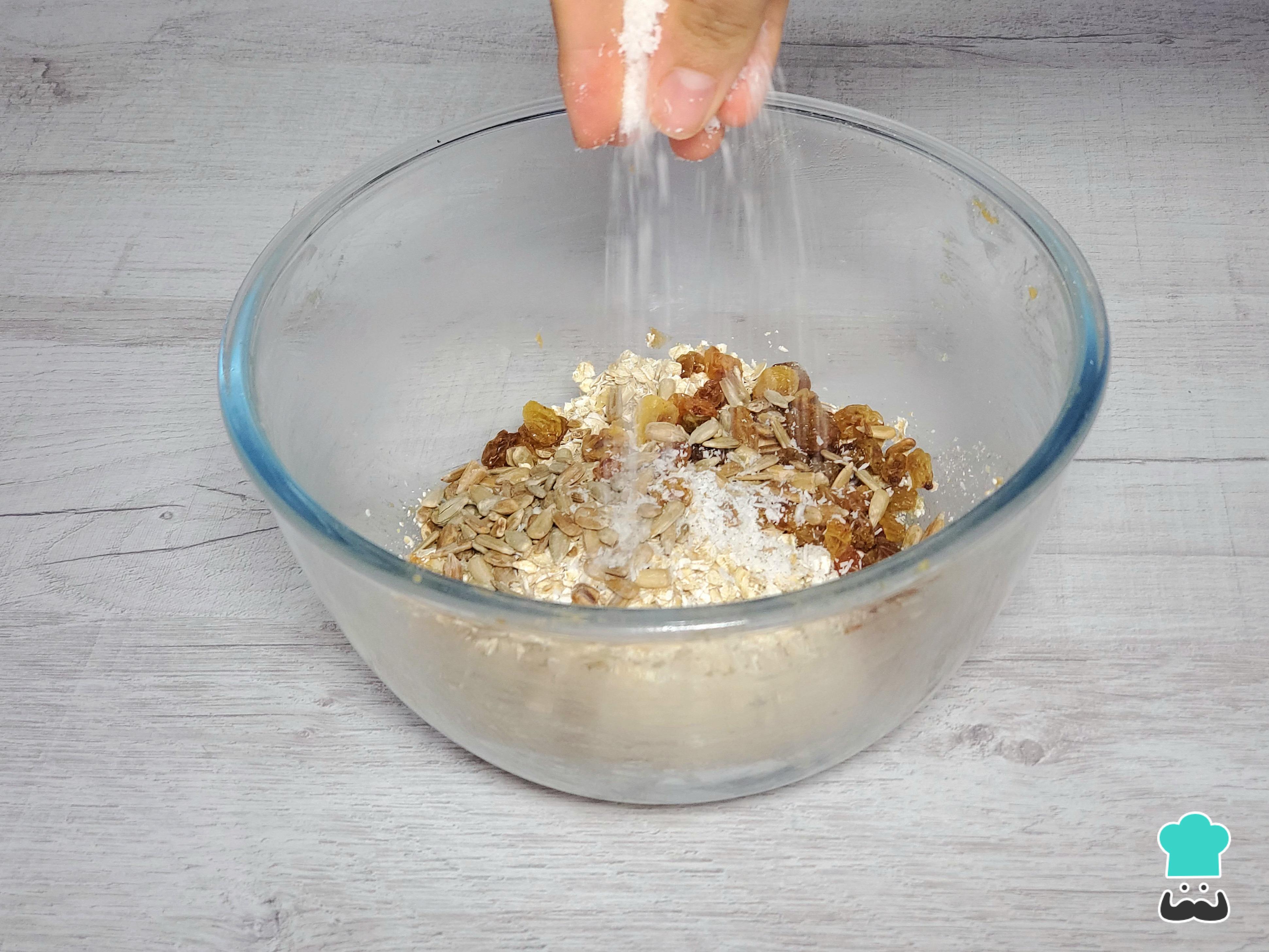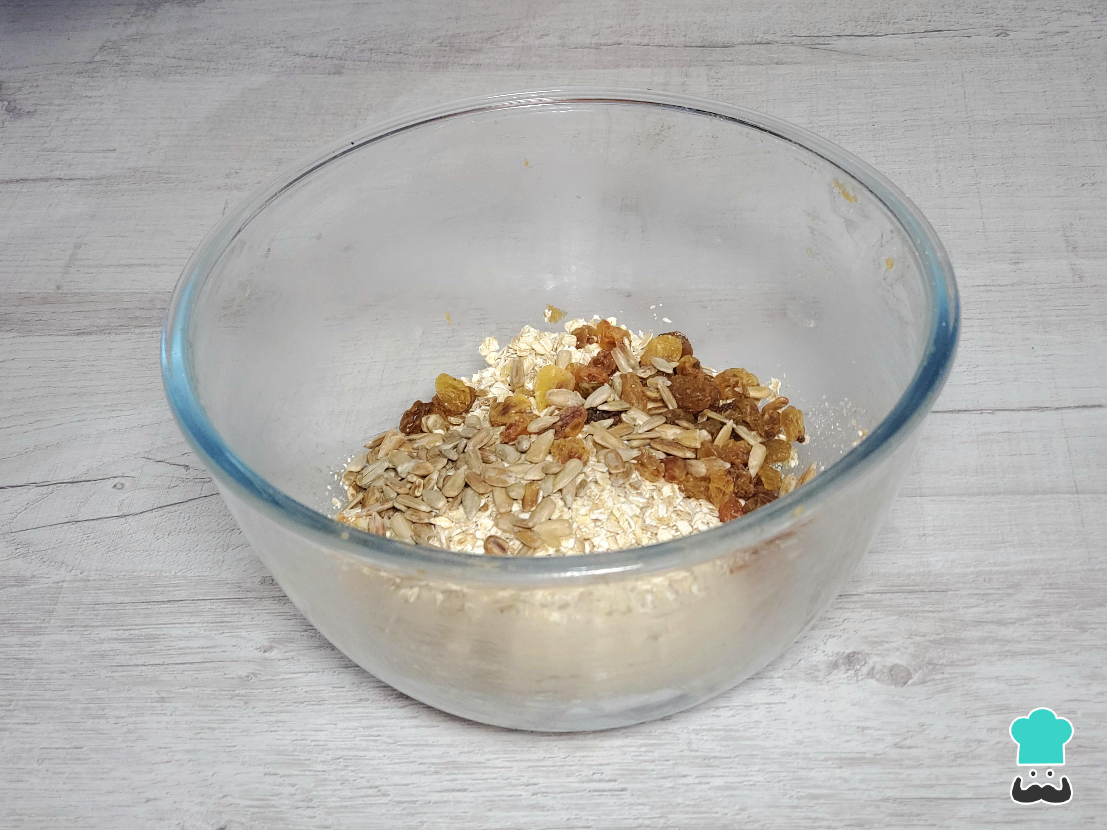 Coloca avena en hojuelas en un bowl como base y vierte las semillas de calabaza y, si te gustan las pasas, puedes incorporar rubias o negras, o bien reemplazarlas por otras frutas deshidratadas como arándanos, kiwi o fresas liofilizadas. Eso sí, añádelas una vez que la granola esté lista, ya que al hornearlas podrían perder su color y quemarse debido a su alto contenido natural de azúcar.