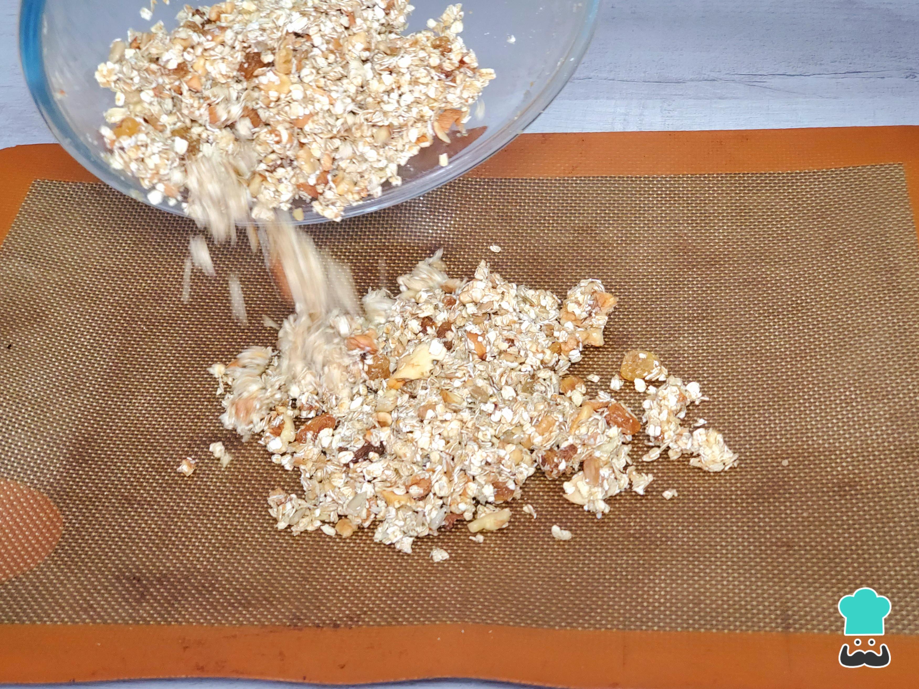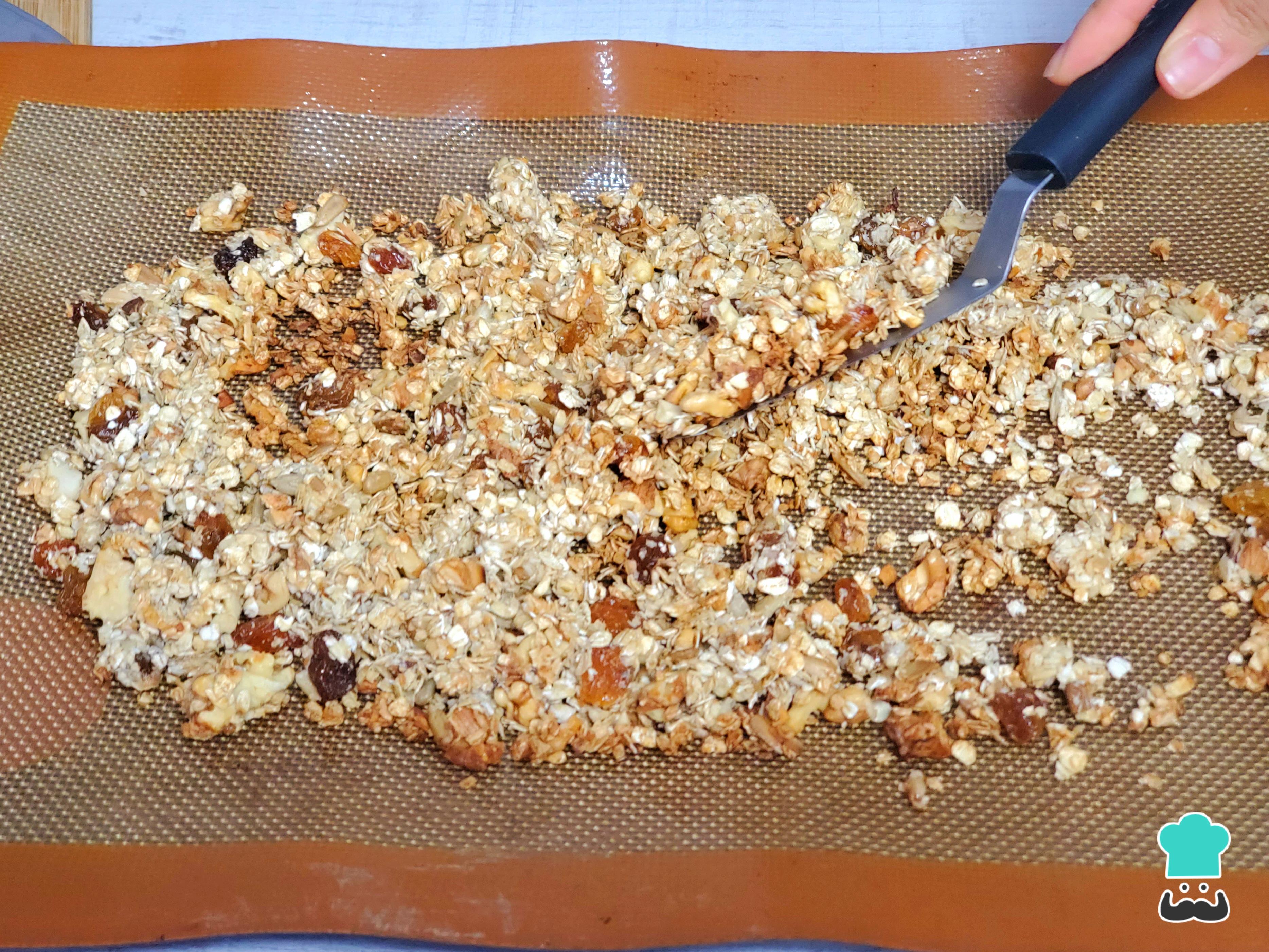 Distribuye la granola sobre una bandeja cubierta con papel manteca para evitar que se pegue, y hornea a 165 °C durante unos 10 minutos o hasta que se vea dorada.
