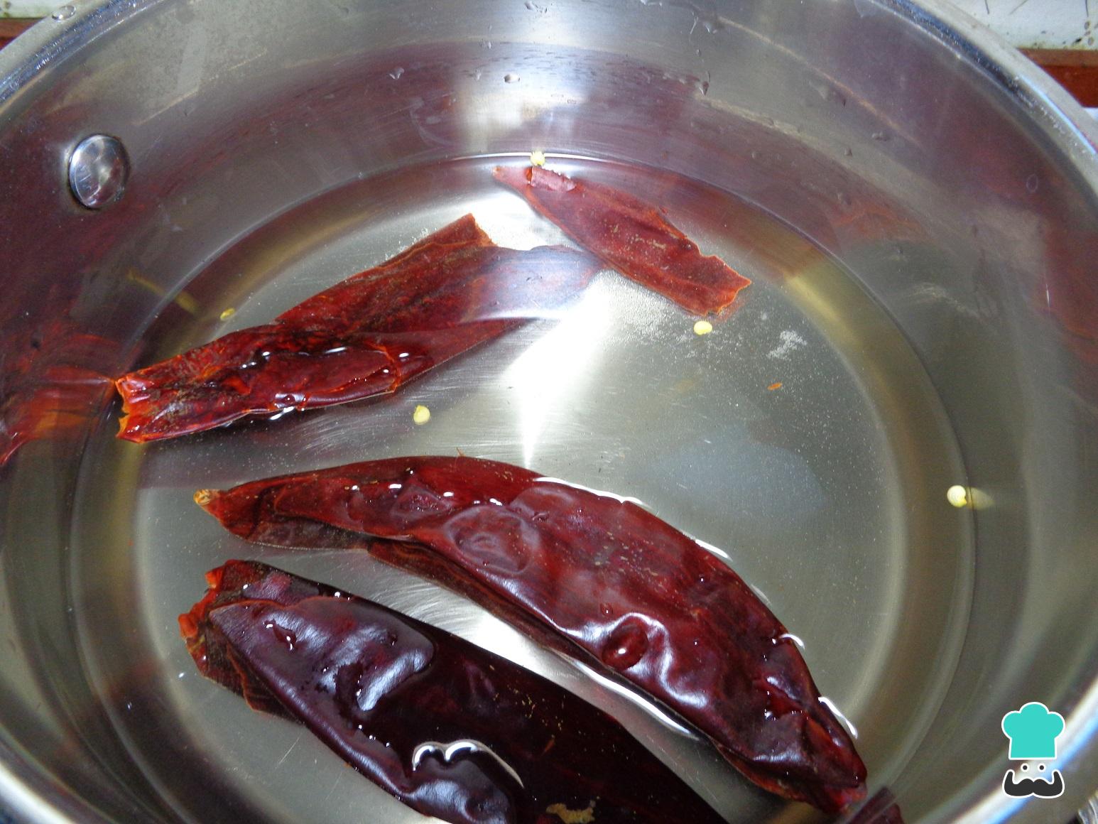 Desvenamos y lavamos perfectamente los chiles guajillo. Posteriormente, los agregamos a una cacerola profunda con agua y una pizca de sal, y los ponemos a hervir a fuego lento para ablandarlos.