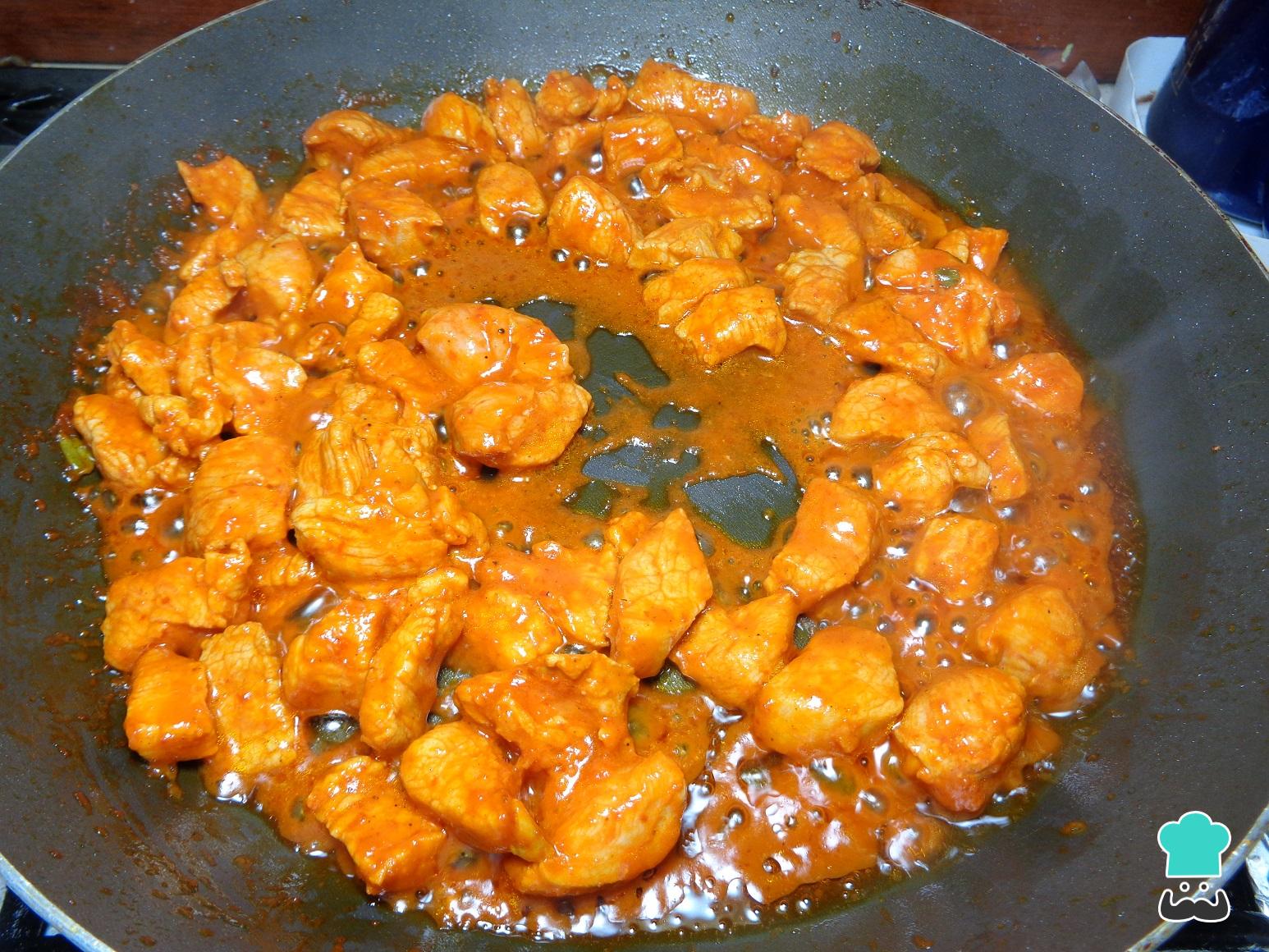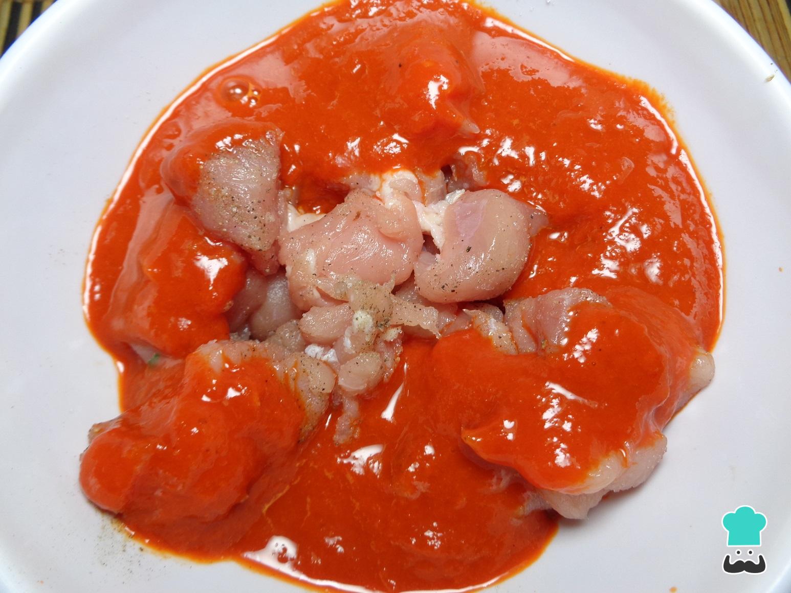 Posteriormente, lavamos la carne de cerdo y la cortamos en cuadros pequeños, los colocamos en un recipiente profundo y agregamos la salsa roja anterior. Mezclamos y dejamos marinar la carne durante una hora en el refrigerador.