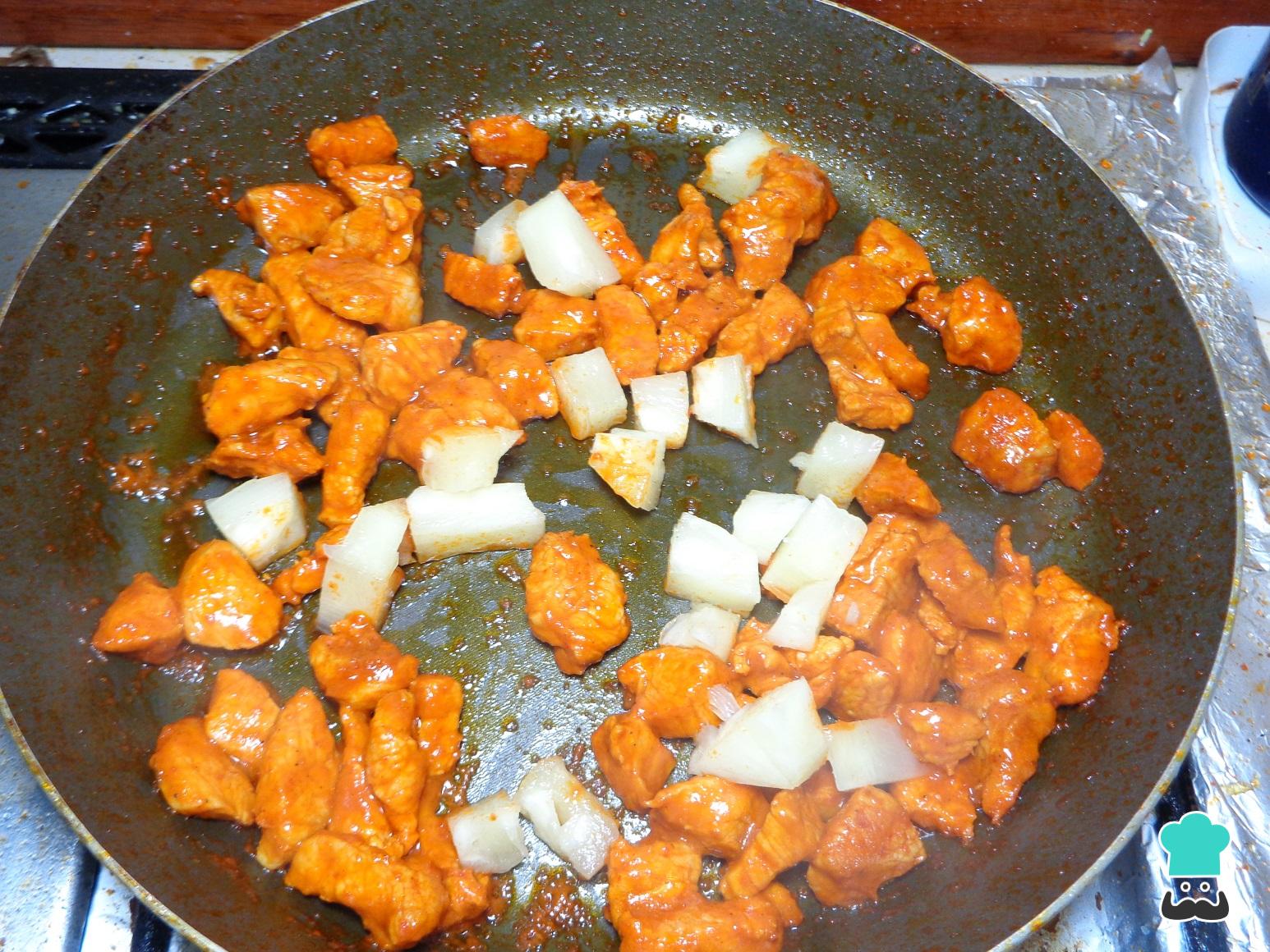 Cuando la preparación anterior esté cocinada, añadimos la piña picada y dejamos que el sabor de la fruta se incorpore a la carne. Seguimos removiendo constantemente y retiramos el relleno del fuego una vez que observemos que la piña empieza tomar un aspecto dorado.