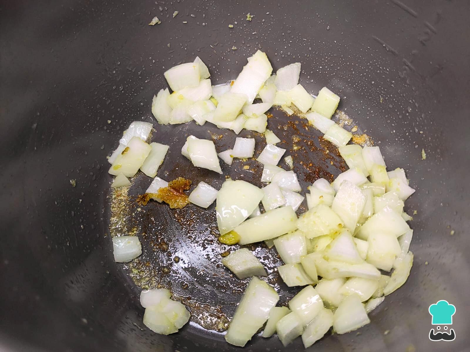 Calienta el aceite y sofríe la cebolla y ajo picado por unos 4 minutos.