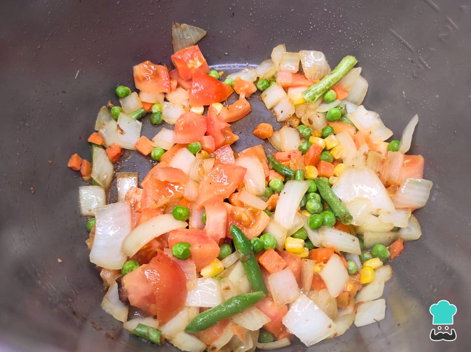 Agrega la zanahoria, choclo, porotos verdes, tomate y arvejas al sofrito. Continúa cocinando por alrededor de 3 minutos.