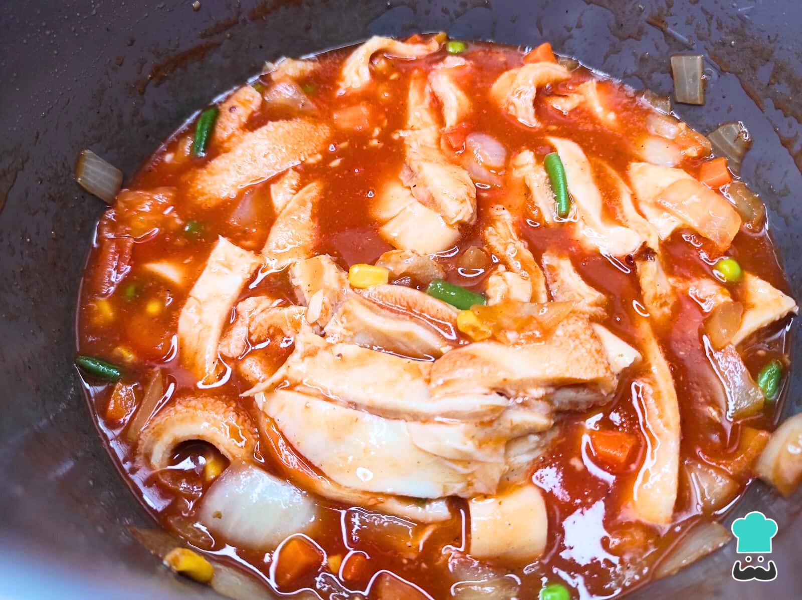 Añade la salsa de tomate, la taza del caldo de cocción de las guatitas y los aliños. Cocina hasta que hierva.