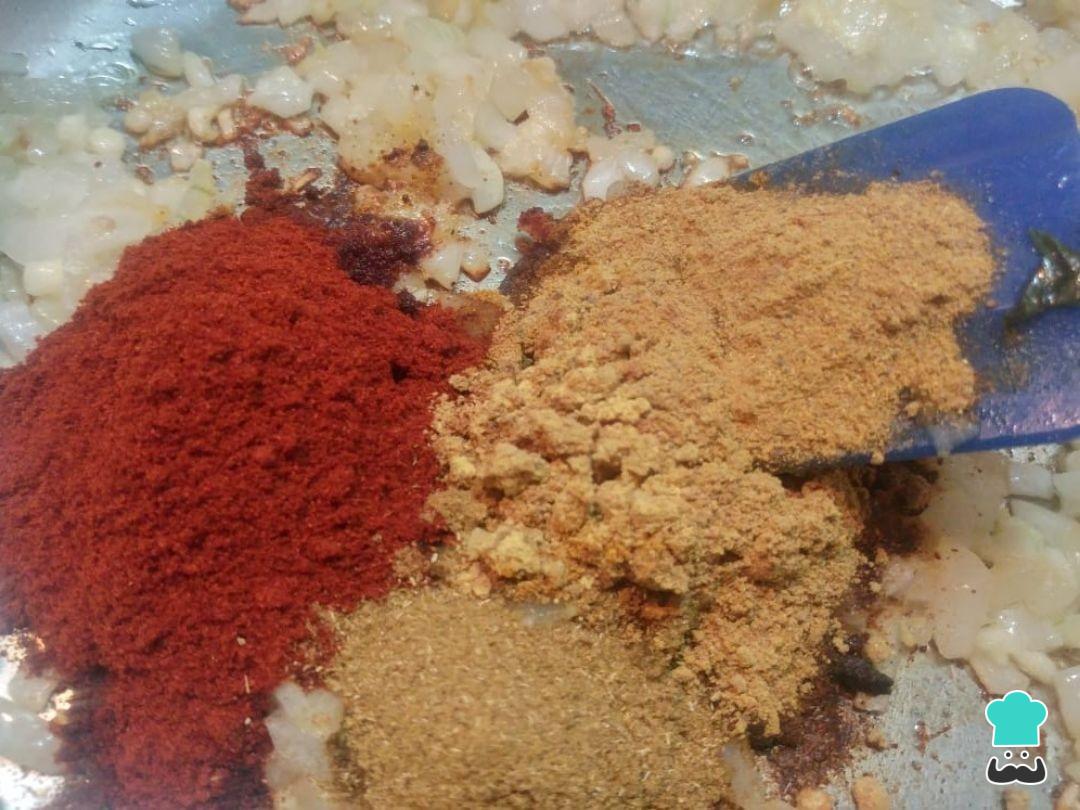 Calienta el aceite en una olla y sofríe la cebolla picada durante varios minutos. A continuación incorpora el ajo picado, el jengibre fresco, el comino, el pimentón y la mezcla de especias que hemos preparado. Remueve y sofríe 2 minutos más sin dejar de remover.