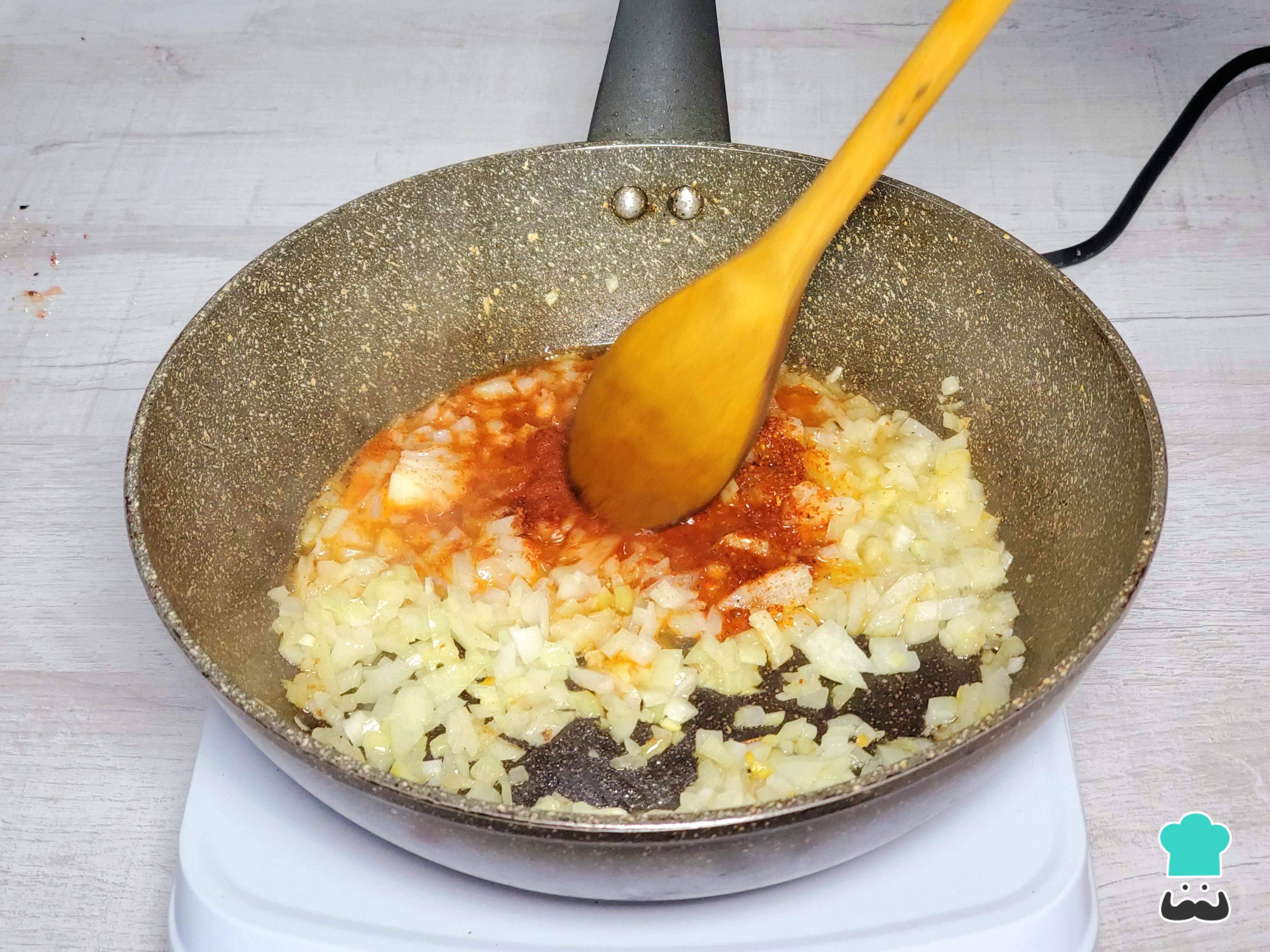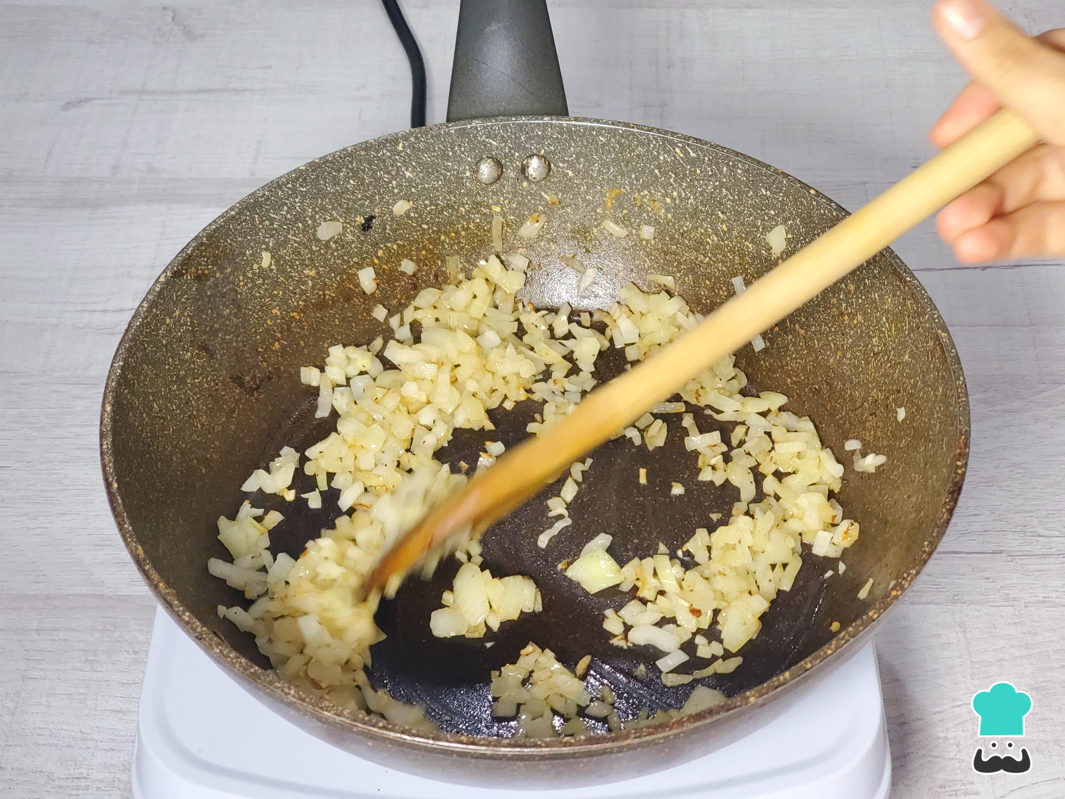 En la misma sartén, añade la cebolla finamente picada y, si es necesario, vierte otro chorro de aceite. Remueve bien para despegar los restos caramelizados del fondo.