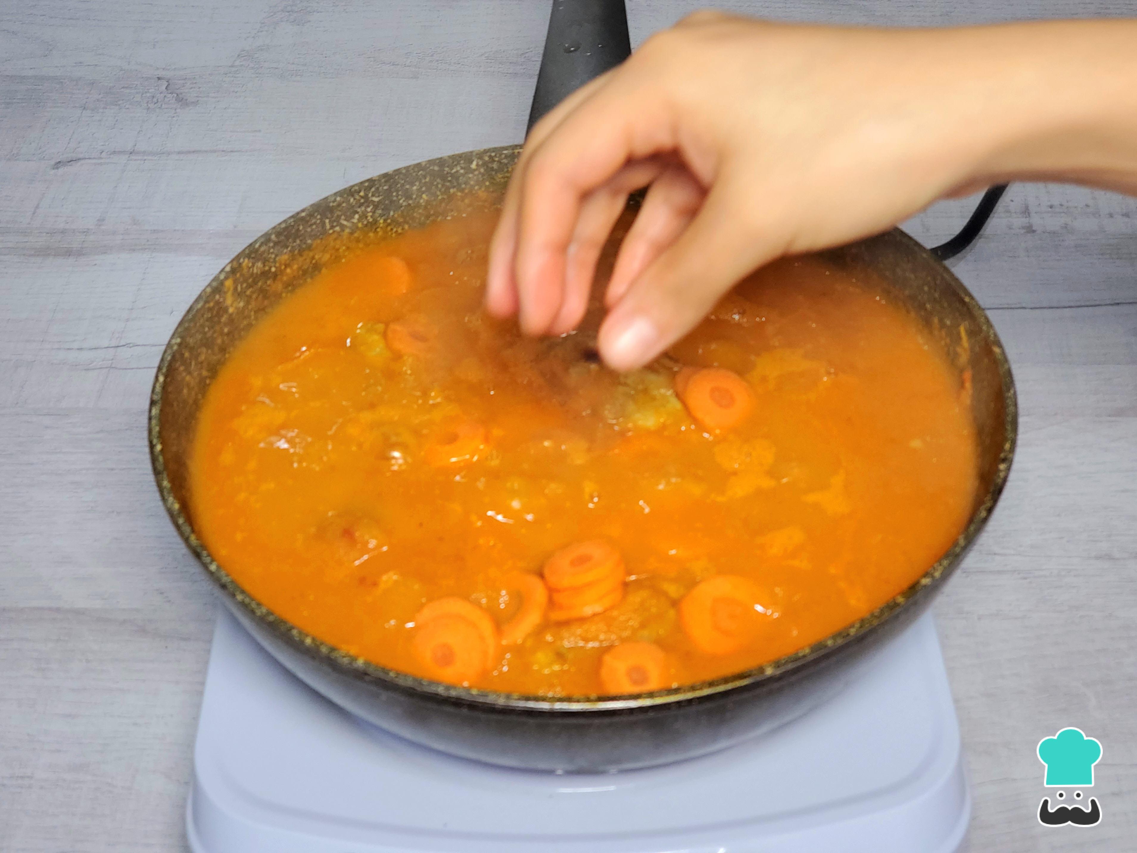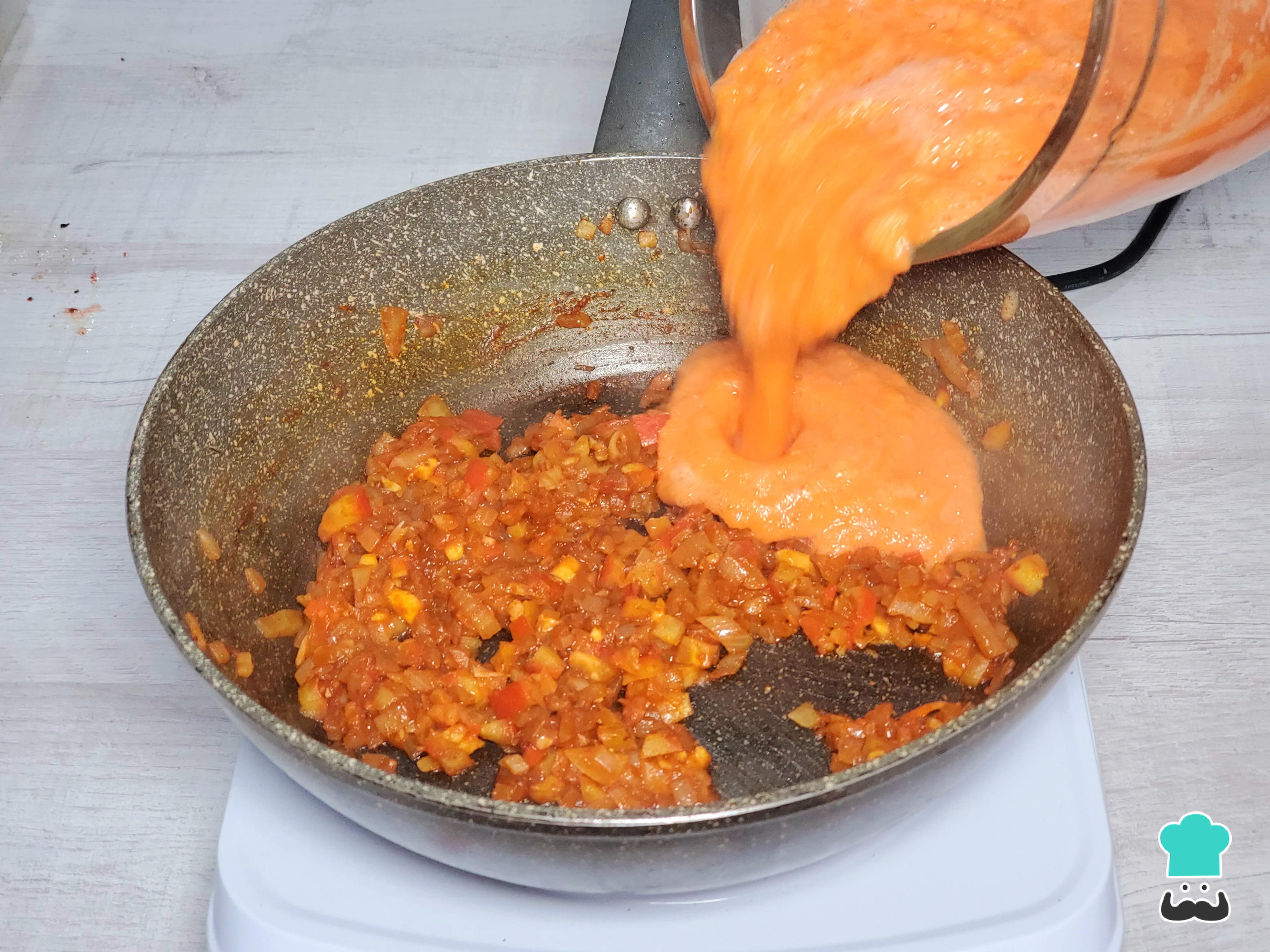 Mientras se cocina el aderezo, coloca en la licuadora las zanahorias y el tomate en cubos. Vierte agua hasta cubrir y licúa hasta obtener una salsa homogénea. Luego, vierte esta salsa en la sartén con el aderezo junto con la pasta de tomate.