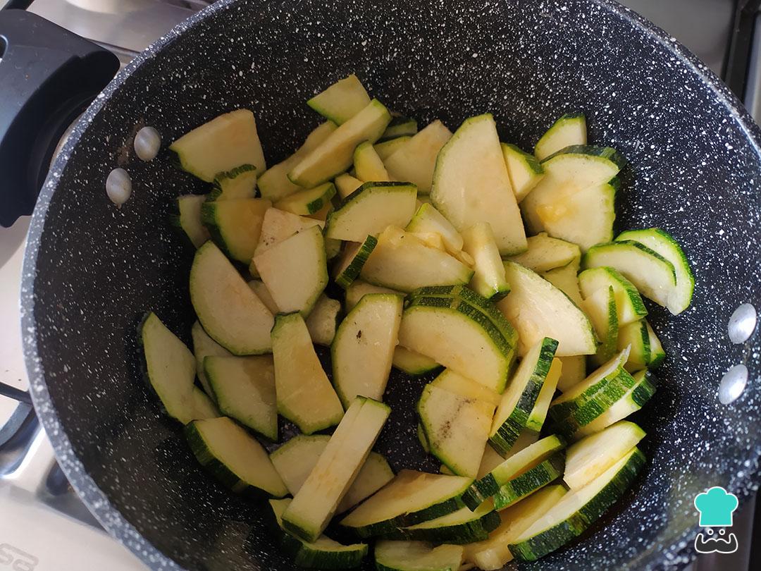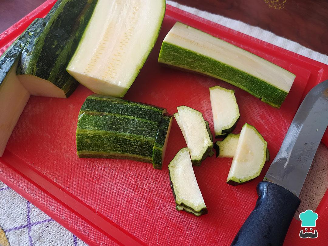 Para comenzar con este guiso de zapallo italiano vegetariano, lava muy bien los zapallos, retira los extremos y córtalos en semicírculos medianos. Por lo general, estas recetas se preparan con la piel del zapallo, pero también puedes hacerlo con el zapallo sin piel.