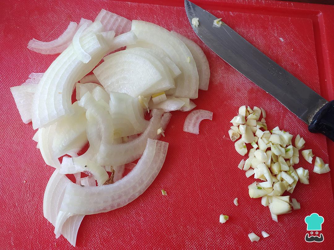 Corta el ajo muy pequeño y la cebolla en julianas delgadas.