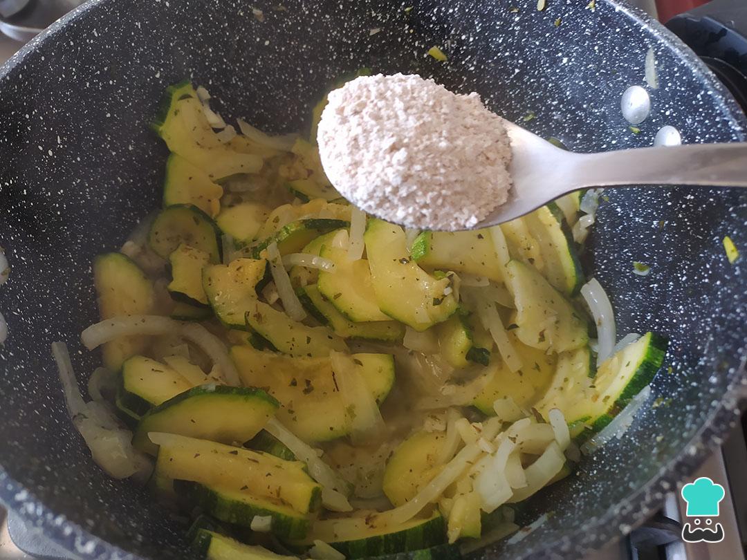 Continúa con el guiso de zapallo italiano sin huevo y agrega la leche, la mantequilla, el orégano y harina a los zapallos. Revuelve bien hasta que quede espeso. Si queda muy espeso agrega más leche.