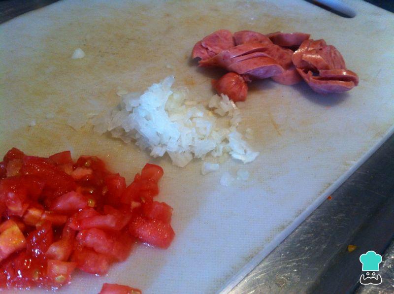 A continuación picamos todo finamente. La cebolla en cubos pequeñitos, pelamos y cortamos el tomate en cubos y cortamos el chorizo el rodajas longitudinales o tajadas.