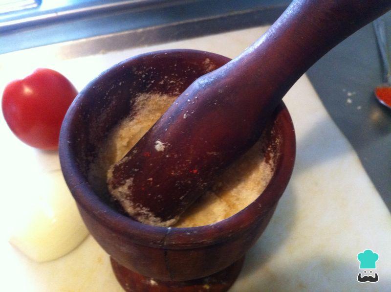 Por otra parte, machacamos el ajo en un mortero con un poco de sal.