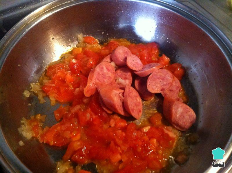 Ahora en una olla pondremos a calentar 4 cucharas de aceite. Cuando esté bien caliente, haremos un sofrito de cebolla y ajo. Cuando empiece a verse transparente la cebolla, incorporamos el tomate y el chorizo y salteamos todo junto un par de minutos.