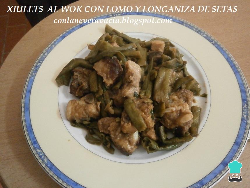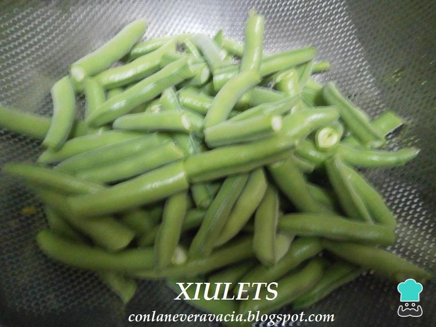 Limpia, corta en trozos y lava las habas tiernas o xiulets. Aparte, corta la longaniza y el lomo en trozos, y la cebolla en juliana un poco ancha.