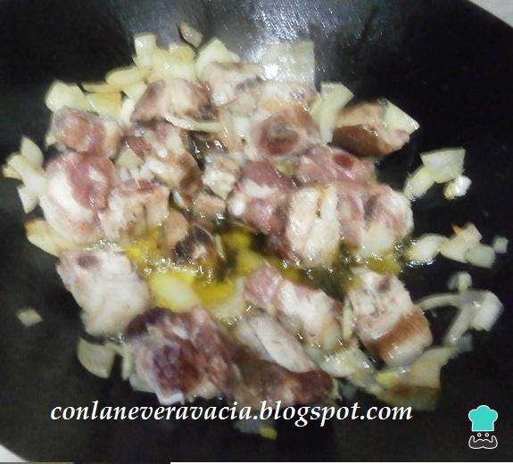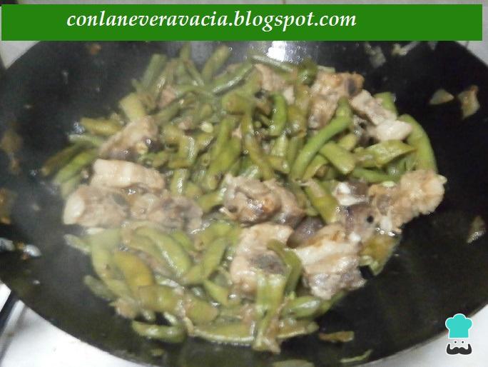En el wok pon aceite a calentar y, cuando esté caliente, añade la carne y la longaniza. Deja cocinar estos ingredientes hasta dorar. Cuando veas que ya está, retira la carne y la longaniza, y pocha la cebolla en el mismo wok. Una vez observes que la cebolla está lista, incorpora las habas tiernas, remueve bien, añade sal al gusto, tapa y deja que se vayan haciendo a fuego vivo, removiendo de vez en cuando para que no se peguen o se queme la cebolla.