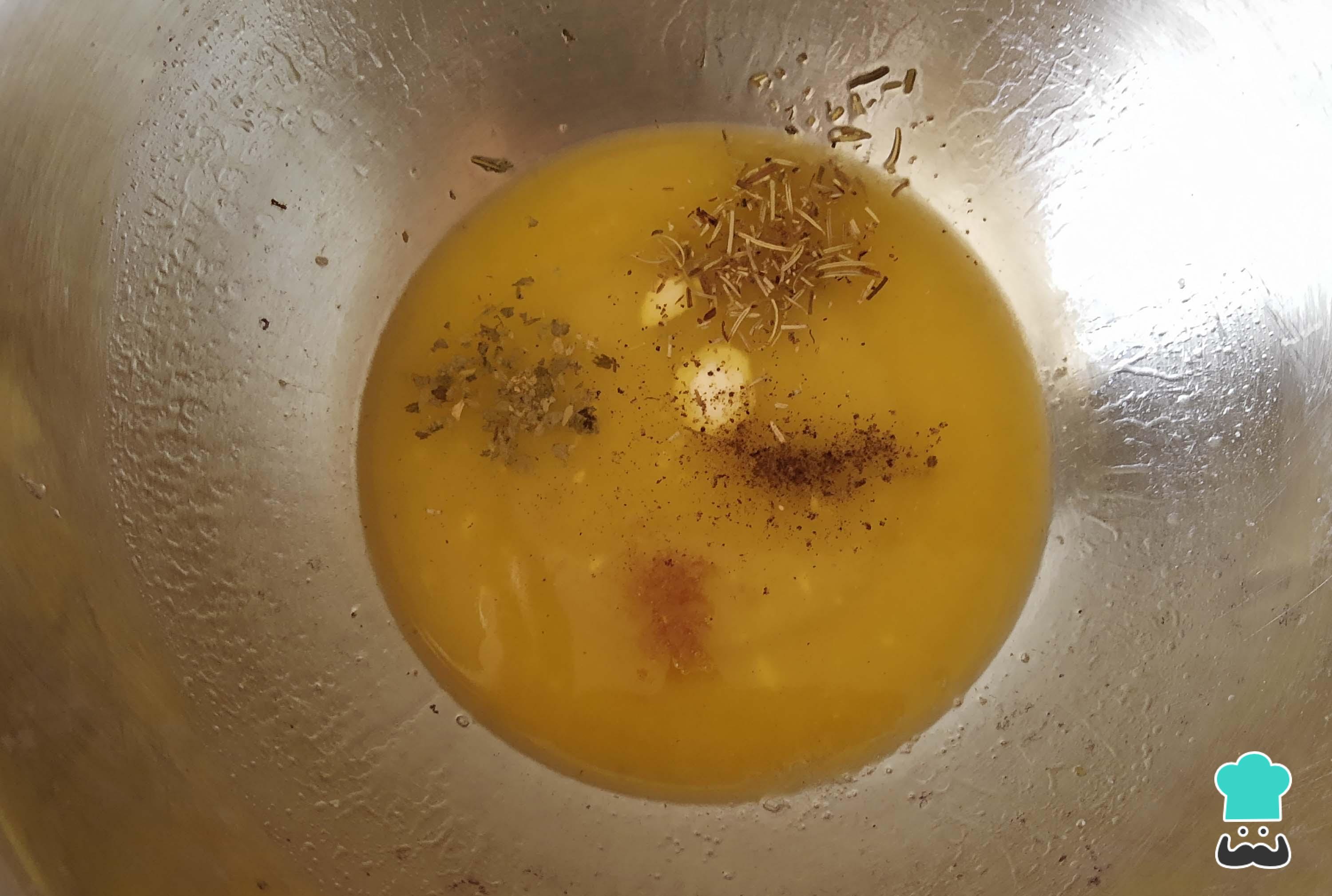 Comienza la receta de hamburguesa preparando la arrachera marinada. Para ello, en un recipiente mezcla mantequilla derretida, una cucharadita de ajo en polvo, 1 cucharadita de romero, 1 cucharadita de tomillo, una pizca de pimienta y un poco de sal en grano.