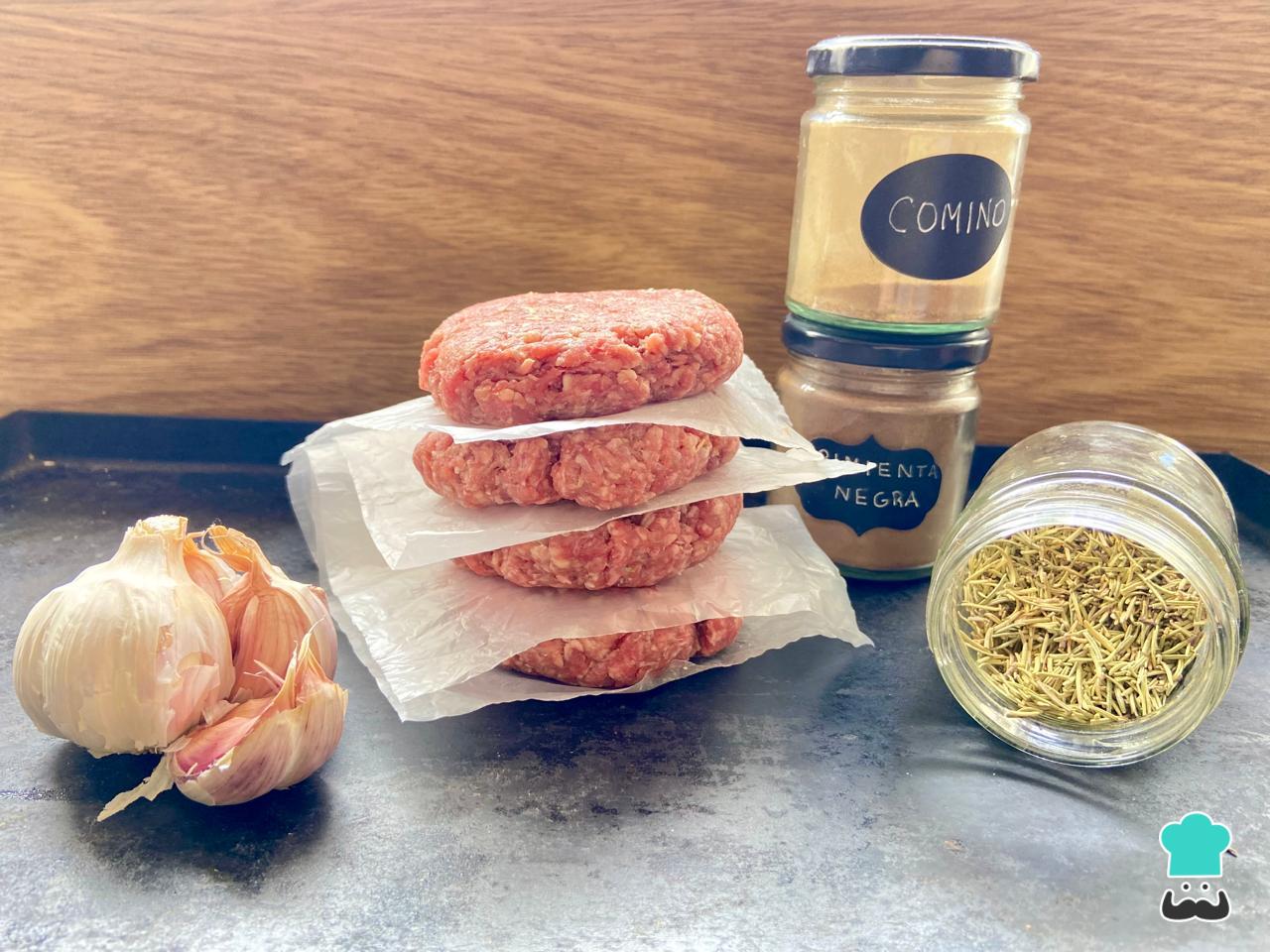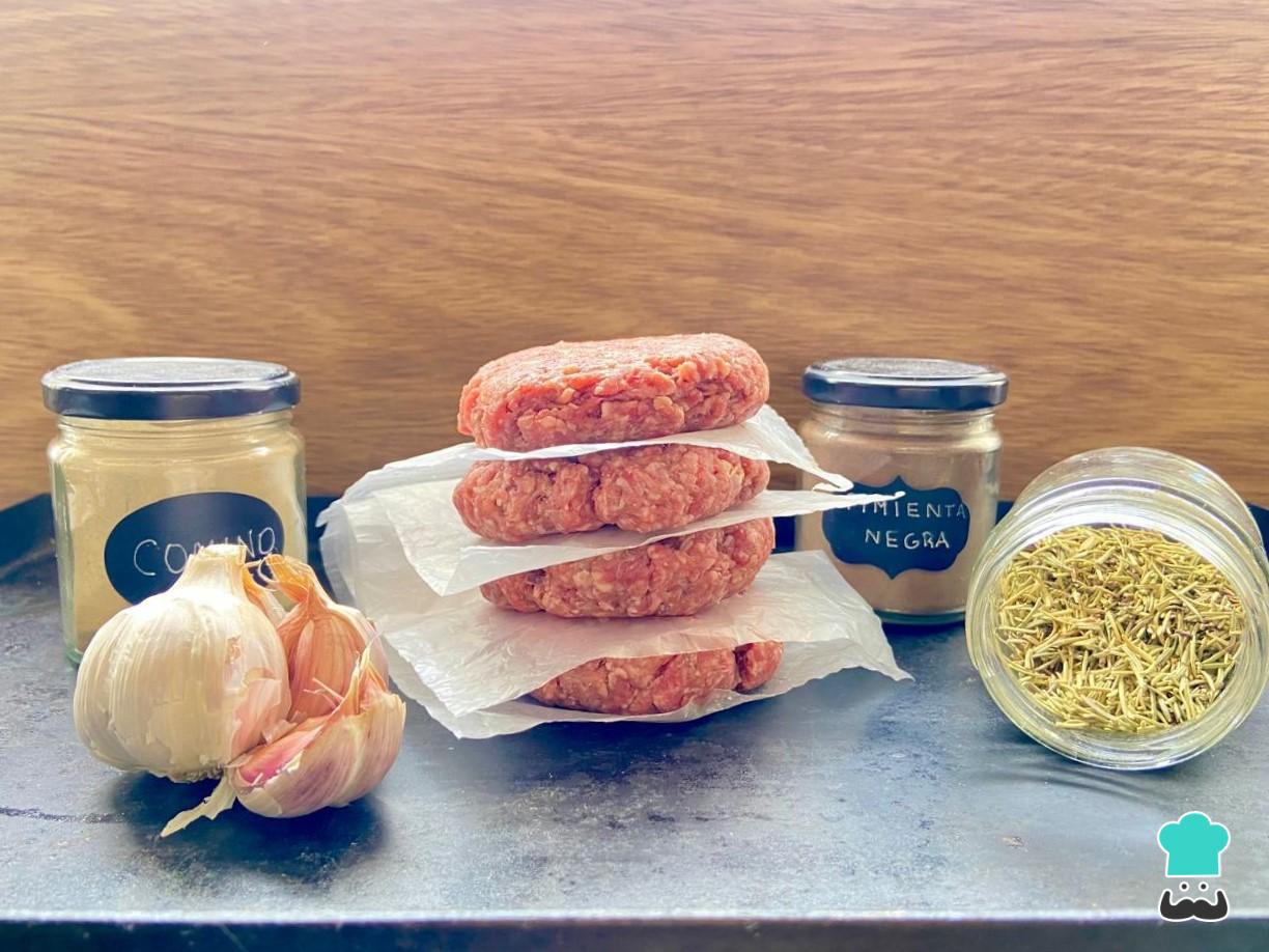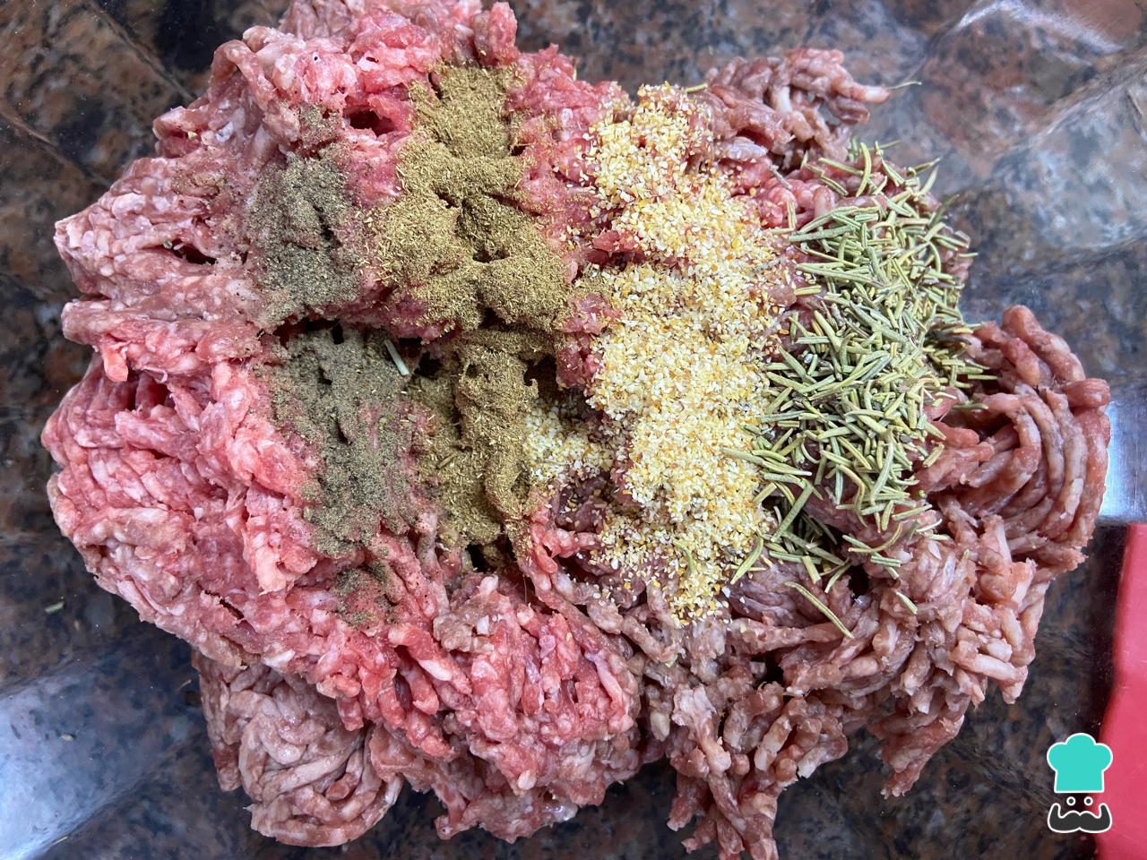 Coloca la carne molida en un recipiente y añade el ajo deshidratado, la sal, la pimienta, el comino y el romero. Amasa todo para integrar muy bien todos los ingredientes.