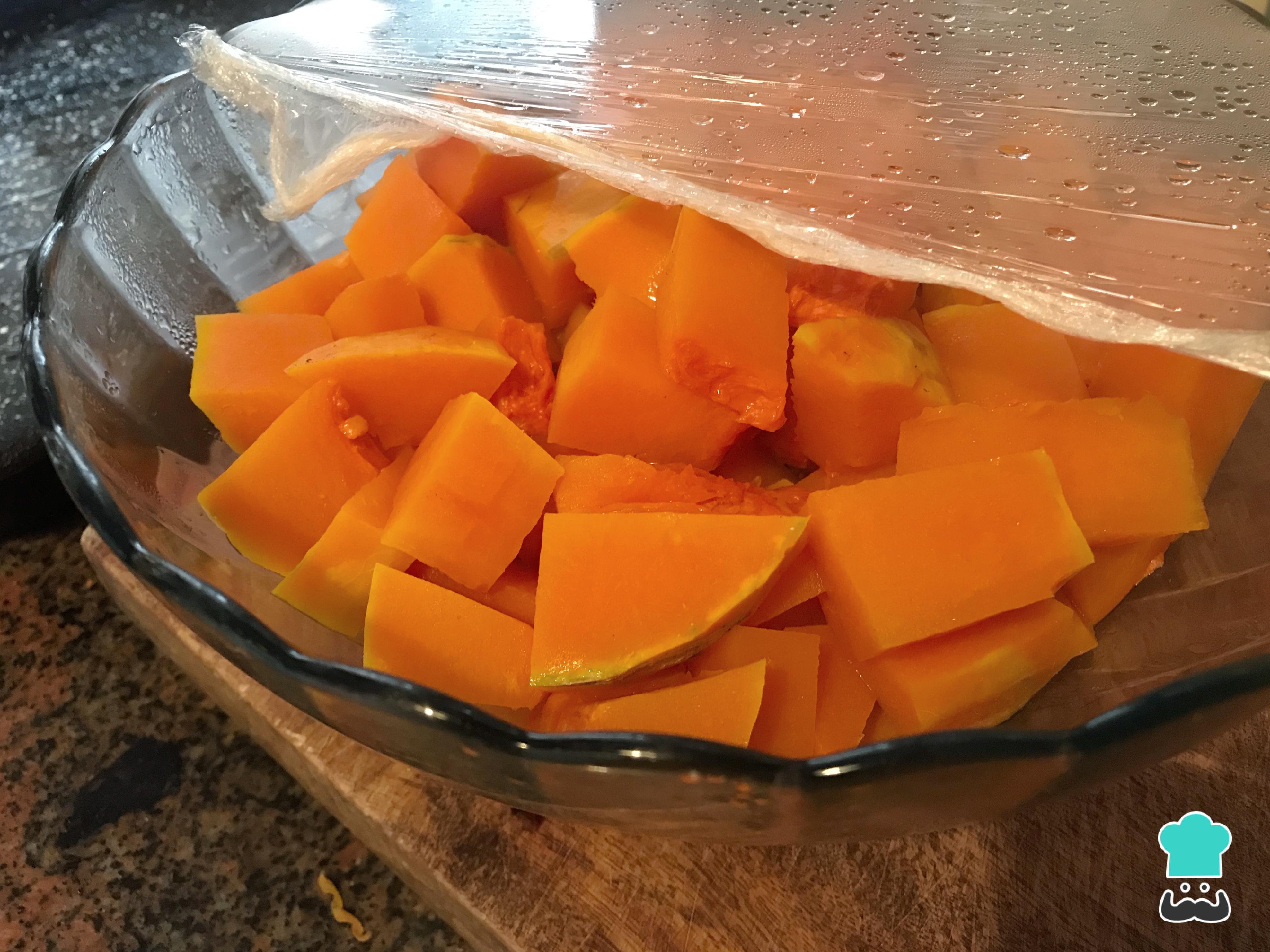 Mientras se cocina el arroz, pela y corta la calabaza en cubos. Cocínala en un recipiente apto tapado con film aproximadamente 6 minutos.