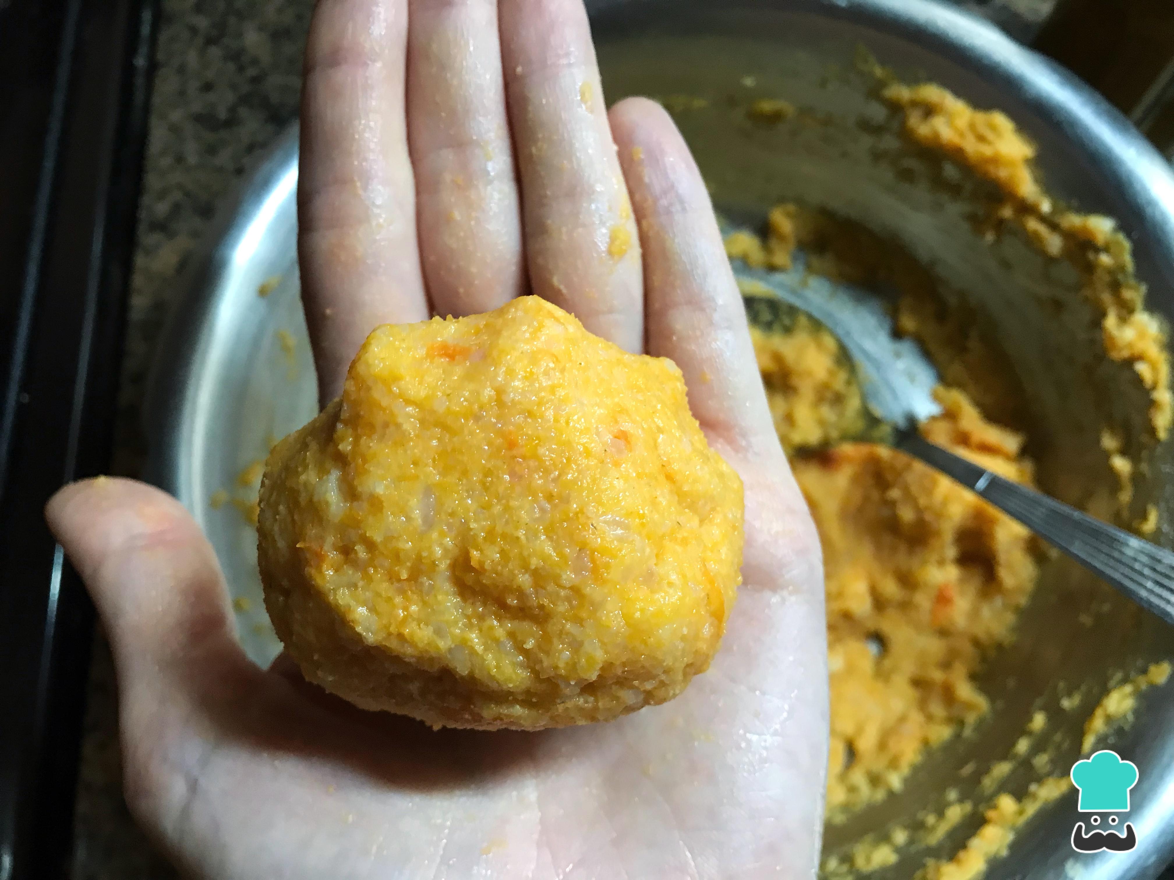 Con la ayuda de las manos húmedas, toma 1 cucharada de la preparación y haz 2 o 3 pelotitas del mismo tamaño.