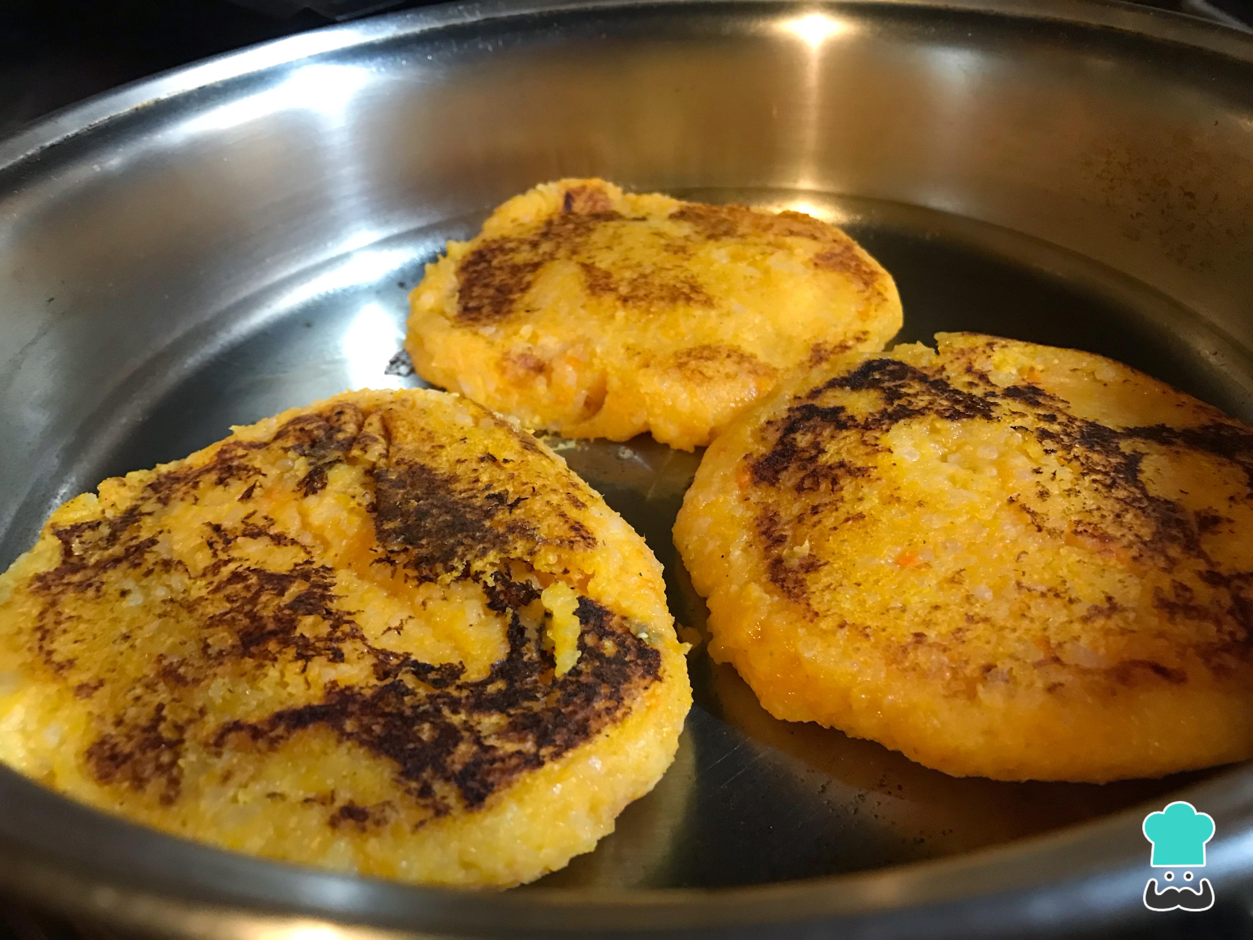 Truco: todos los ingredientes de las hamburguesas de calabaza y arroz están cocidos, por tanto, lo que buscamos en este punto es lograr que mantengan su forma y tomen sabor al dorarlas.