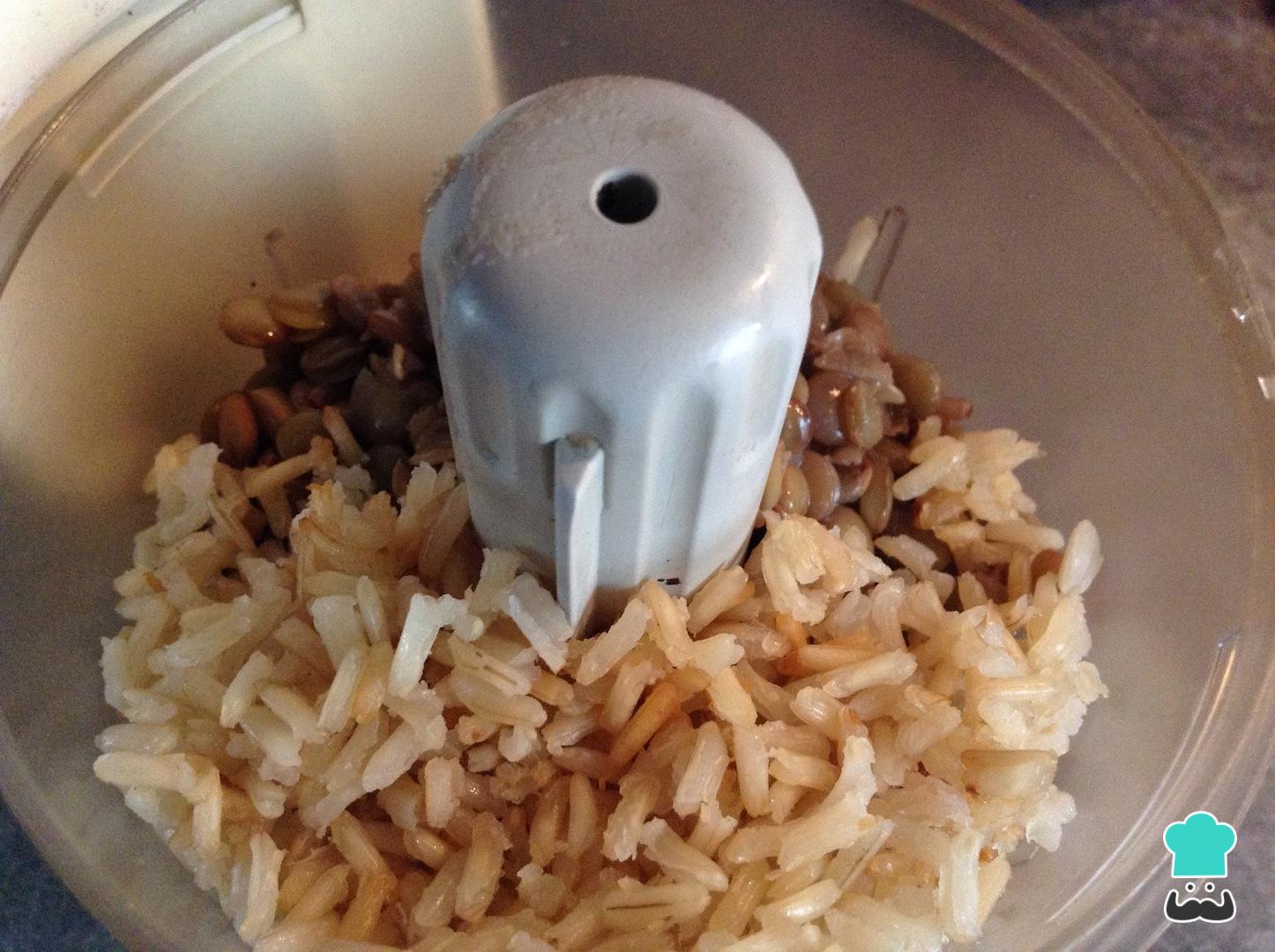 Lleva a un procesador de alimentos o licuadora el arroz integral cocinado y las lentejas cocinadas. Procesa hasta lograr una masa unificada.